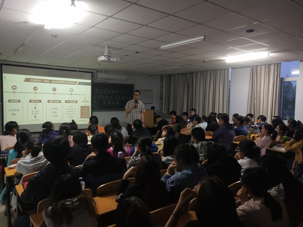 王晓瑭介绍了大赛来源、背景和目的,并从“互联网+”大赛历届数据分析、案例入手详细讲解了第五届“互联网+”大学生创新创业大赛的新规定以及学院如何做好备赛工作。