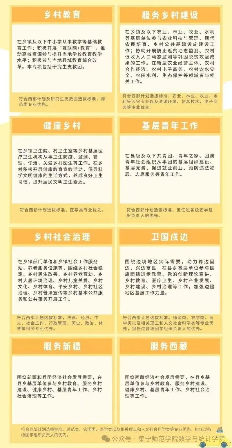 西部计划设置乡村教育、服务乡村建设、健康乡村、基层青年工作、乡村社会治理、卫国戍边、服务新疆、服务西藏8个专项。西部计划志愿者服务期为1至3年,服务协议一年一签。