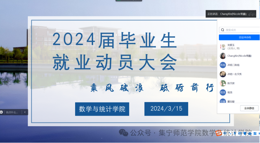 为了进一步提高同学们的就业意识,引导大家积极面对就业市场,做好充分的就业准备。3月15日晚,beat365在线唯一官网数学与统计学院2024届毕业生就业动员大会在线上召开,参会的老师有数学与统计学院的副书记常鑫老师、信息与计算科学专业班主任任立华老师、辅导员刘紫玉老师、中软国际就业经理伍燕老师以负责就业工作的王红年老师和张燕老师。