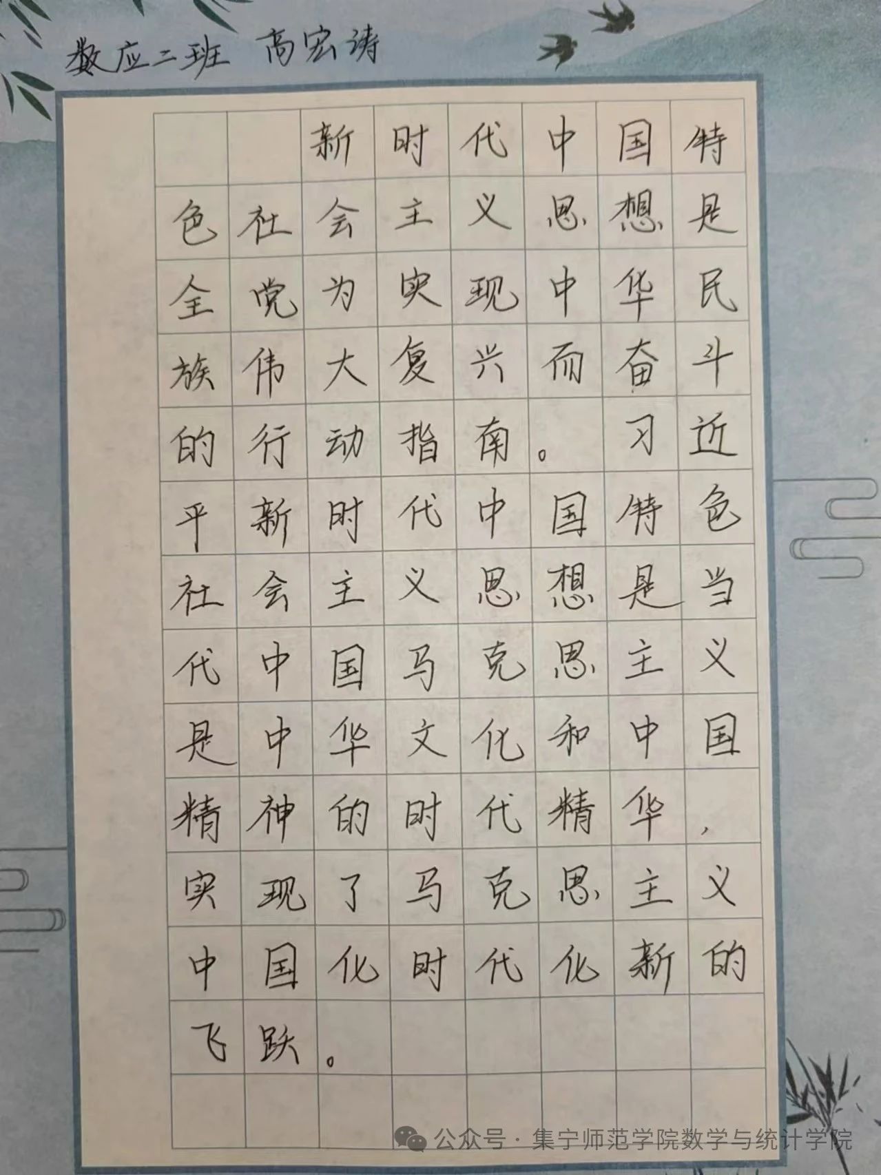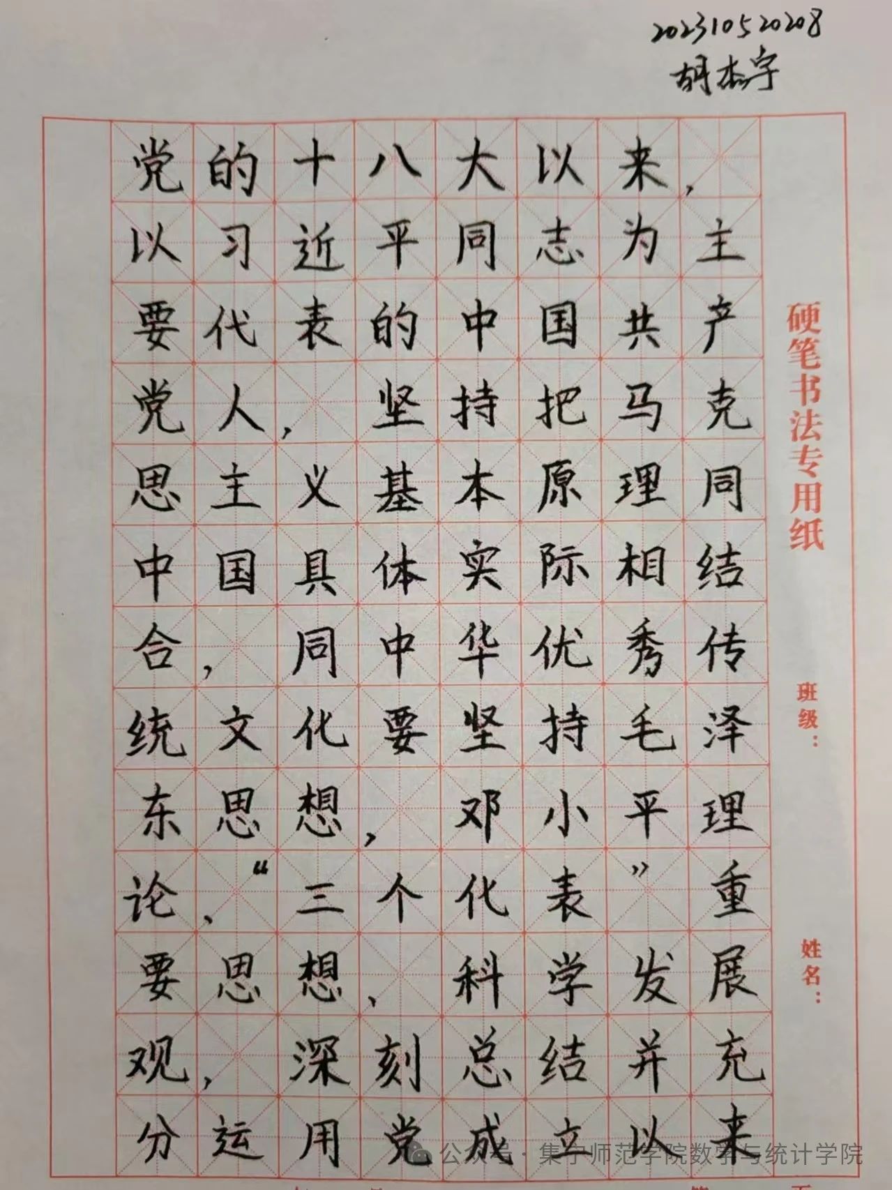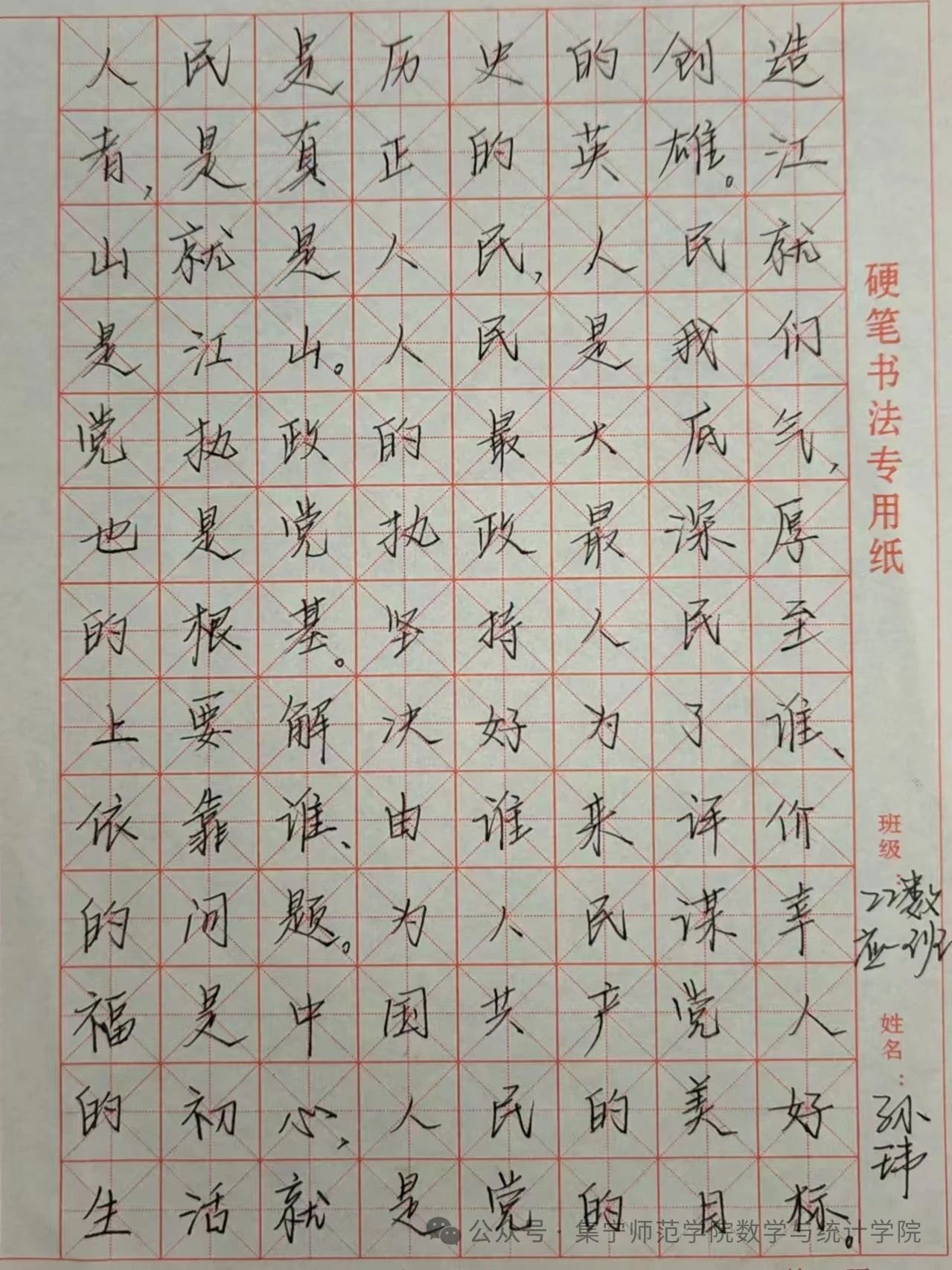 三笔字,即钢笔字、粉笔字、毛笔字,它不仅是师范生一种专业的技能,更是一种艺术体现,为了提高师范生的书写水平,弘扬中华优秀传统文化。我院于10月13日开展“墨缘杯”三笔字大赛。同学们对比赛充满热情,积极参加。硬笔书法部分孙玮、高爽、胡杰宇、李宇涵、高宏涛荣获一等奖,推荐2022级数学与应用数学一班孙玮进入校赛。