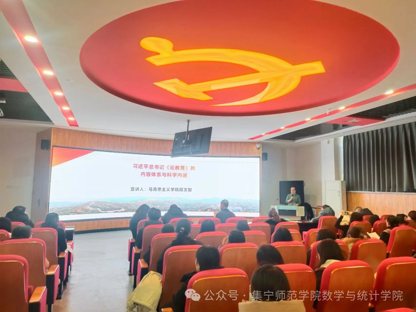 为深入学习贯彻习近平总书记关于教育的重要论述,落实立德树人根本任务,12月5日,数学与统计学院联合外国语学院在主教楼201举办了专题讲座。本次讲座特邀马克思主义学院副院长段文智为师生做以“习近平总书记《论教育》的内容体系与科学内涵”为主题的专题讲座。数学与统计学院和外国语学院的全体教师以及学生代表参加了本次讲座。
