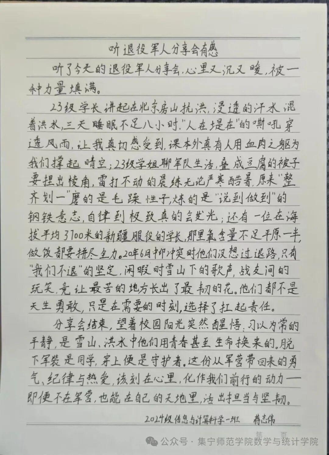 三位退役军人的故事里,藏着卫国戍边的坚守与热血,更饱含着对家国的深情与担当。愿我院学子能传承这份卫国戍边的精神,带着对家国的责任与理想,在各自的赛道上奋力奔跑,让青春在服务社会、奉献家国中绽放光彩。