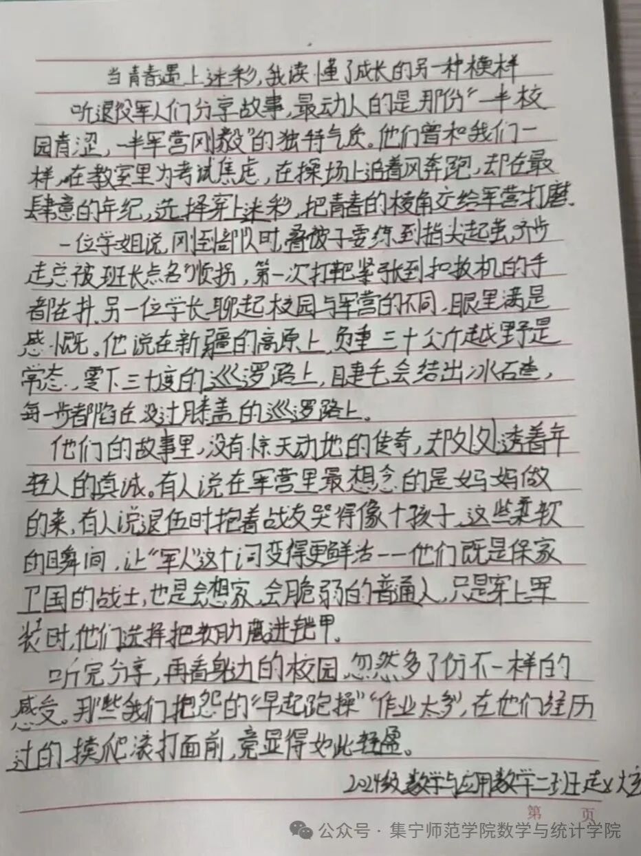 2023级数学与应用数学一班刘梦雪则以部队记录和战友情谊为切入点,她感慨,卫国戍边不是一句口号,而是摔进坑里再爬起的倔强,是和战友们朝着“守护每一寸土地”的目标奔跑的滚烫,那些日子早已刻进骨子里,成为永不褪色的信仰。