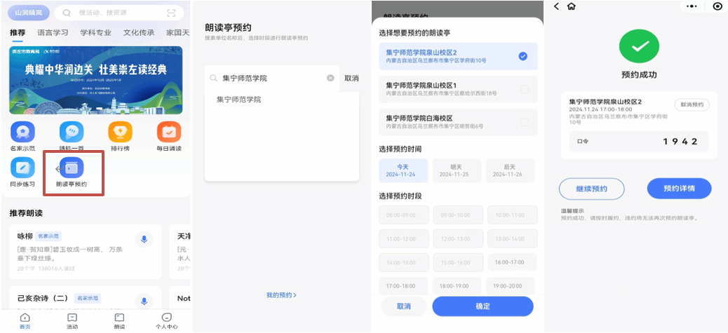第一步(预约):微信小程序搜索“讯飞朗读”→点击“个人中心”,完成注册→点击“首页”,左上角选择“大学”→点击“朗读亭预约”,搜索“beat365在线唯一官网”,选择对应的地点和时间→点击“确定”,保存“预约口令”,完成预约。