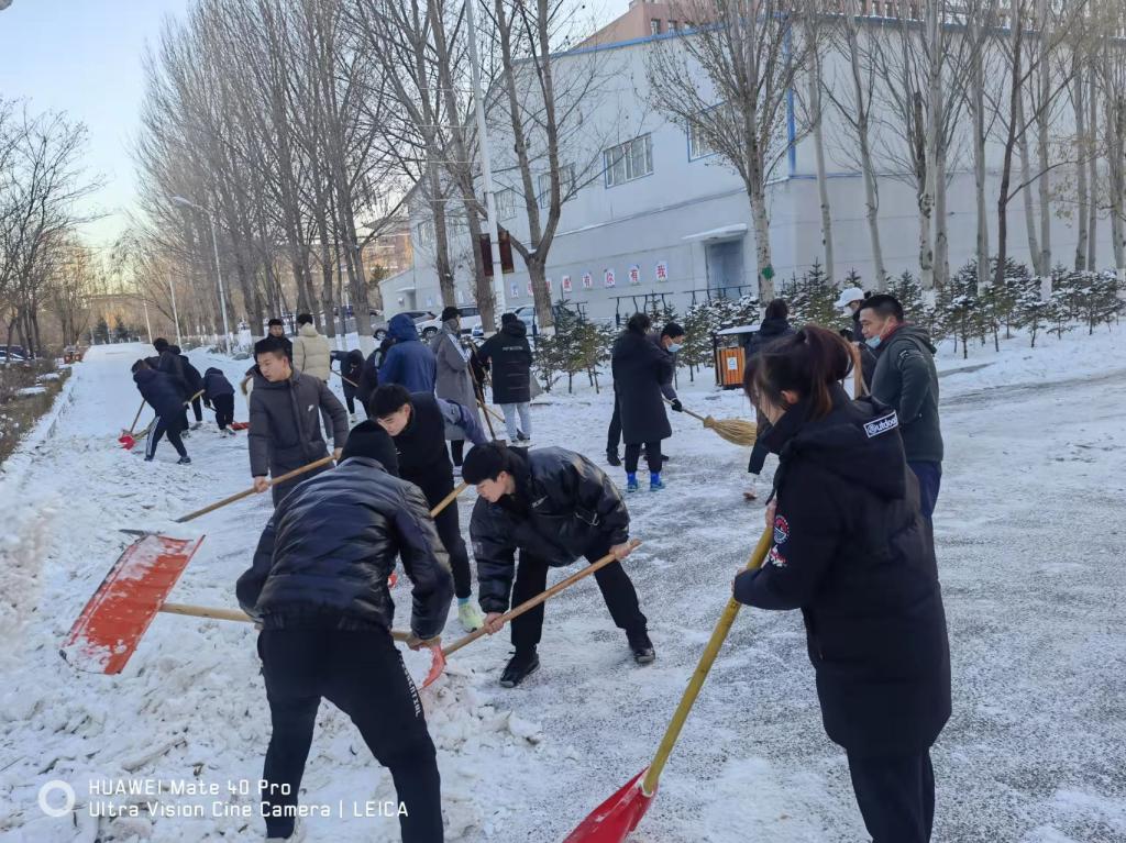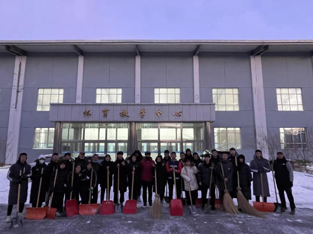 在活动中,大家不畏严寒,相互配合、你铲我扫,经过一个多小时的努力,体育馆前路面的冰雪被清理。寒冷冬日,不仅为师生开辟了一条方便安全的出行通道,更是传递了一份温暖和正能量。