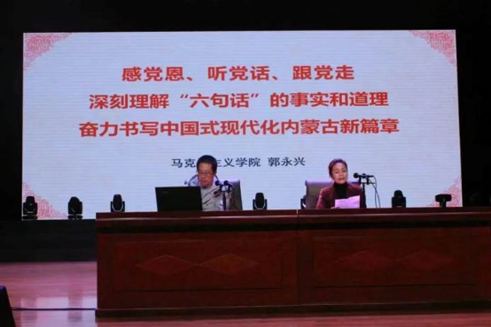 郭永兴老师以“感党恩、听党话、跟党走——深刻理解“六句话”的事实和道理奋力书写中国式现代化内蒙古新篇章”为题,围绕“内蒙古地区是中国共产党最早建立党组织的民族地区”“内蒙古自治区是在中共中央直接领导下建立的”“内蒙古是在党中央的支持下发展起来的”“内蒙古工作中出现的重大偏差都是党中央帮助纠正的”“内蒙古新时代的发展成就是在习近平总书记亲切关怀和指引下取得的”“内蒙古作为模范自治区模范就模范在听党的话上”六个方面进行宣讲,主题鲜明、内容丰富,资料详实,对全体师生深刻领悟习近平总书记对内蒙古的关怀厚爱,领会“六句话”的丰富内涵具有重要指导意义。