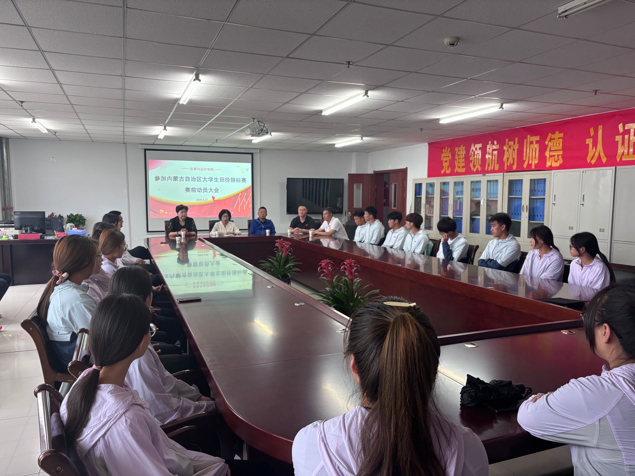 2025年6月27日,内蒙古自治区大学生田径锦标赛赛前动员大会在体育与运动学院会议室隆重召开。会议现场庄重而充满激情,校党委委员、副校长张秀文,体育与运动学院党总支书记牛爱兰,院长侯勇,副院长李欣,教练员田继军、刘宝华以及全体参赛运动员齐聚一堂,共同为即将到来的比赛加油鼓劲。