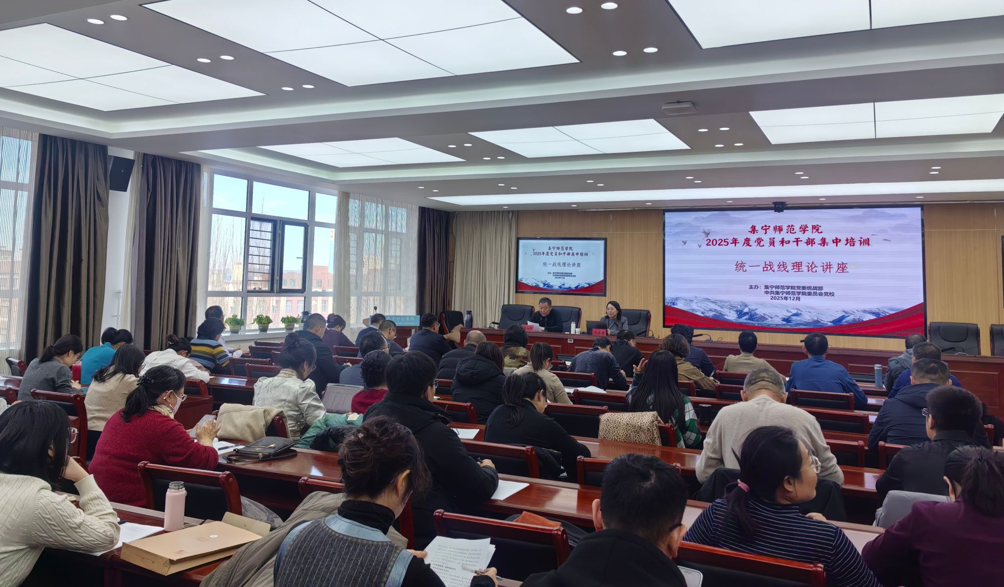 为深入学习贯彻习近平总书记关于加强和改进民族工作的重要思想,有形有感有效深化铸牢中华民族共同体意识教育,推进中华民族共同体建设,根据学校2025年度党员和干部集中培训工作方案要求,12月19日,党委统战部邀请乌兰察布市社会主义学院副院长王永丽教授作“学习习近平总书记关于铸牢中华民族共同体意识的重要论述”专题讲座。各党总支、直属党支部书记、统战委员,各学院学团办主任、教工支部书记、学工支部书记、专职辅导员,附中党委书记、统战委员以及beat365党委统战部全体人员近80人参加会议。会议由党委委员、统战部部长赵向军主持。