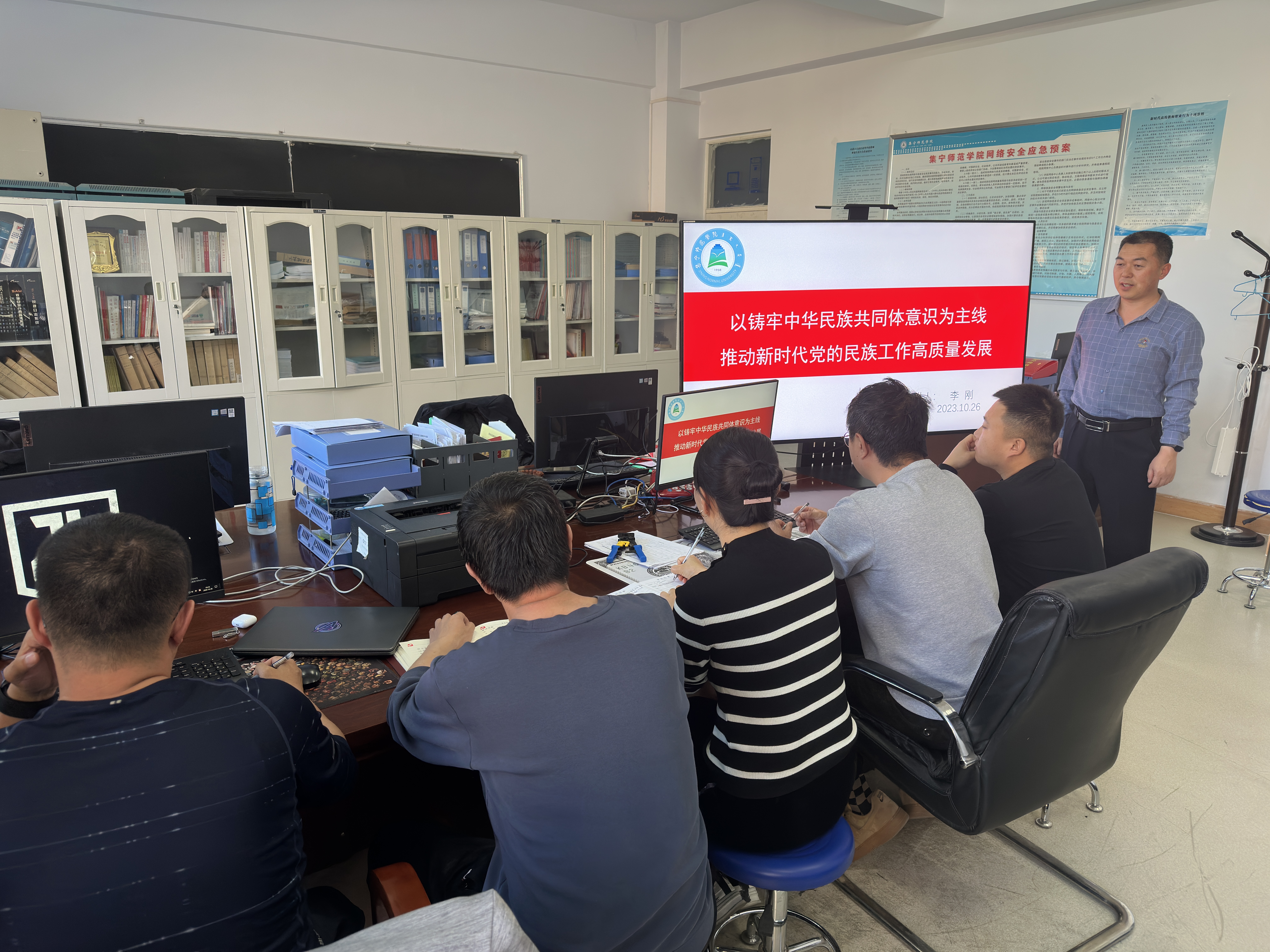 10月26日下午,网络中心党支部书记李刚以《以铸牢中华民族共同体意识为主线推动新时代党的民族工作高质量发展》为题讲授专题党课。会议在网络楼24302召开,部门全体党员参加。