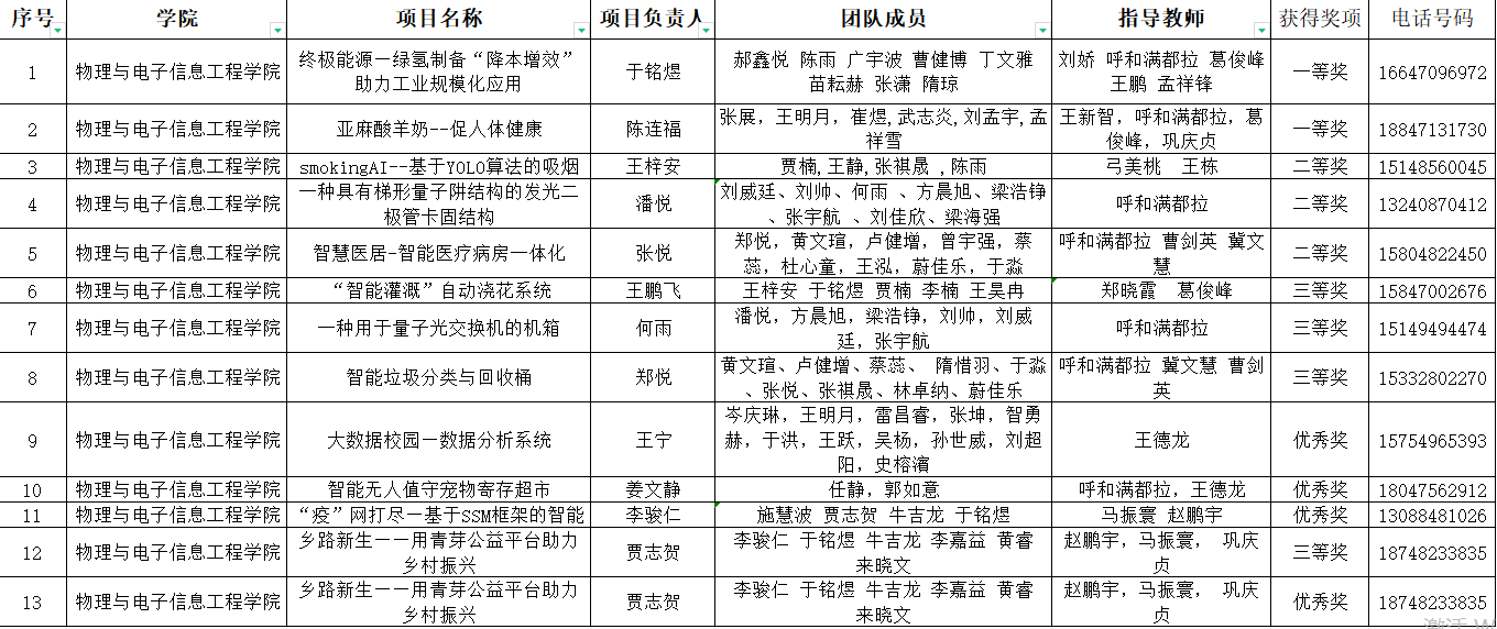 根据《内蒙古自治区教育厅关于举办中国国际大学生创新大赛(2024)内蒙古赛区选拔赛的通知》(内教高函﹝2024﹞30号)精神要求,学校组织开展了中国国际大学生创新大赛(2024)校赛工作。招生就业处组织评委进行校赛评审,评审结果我院获得奖项如下:高教主赛道一等奖2个,二等奖3个,三等奖3个,优秀奖3个;“青年红色筑梦之旅”赛道三等奖1个,优秀奖1个。