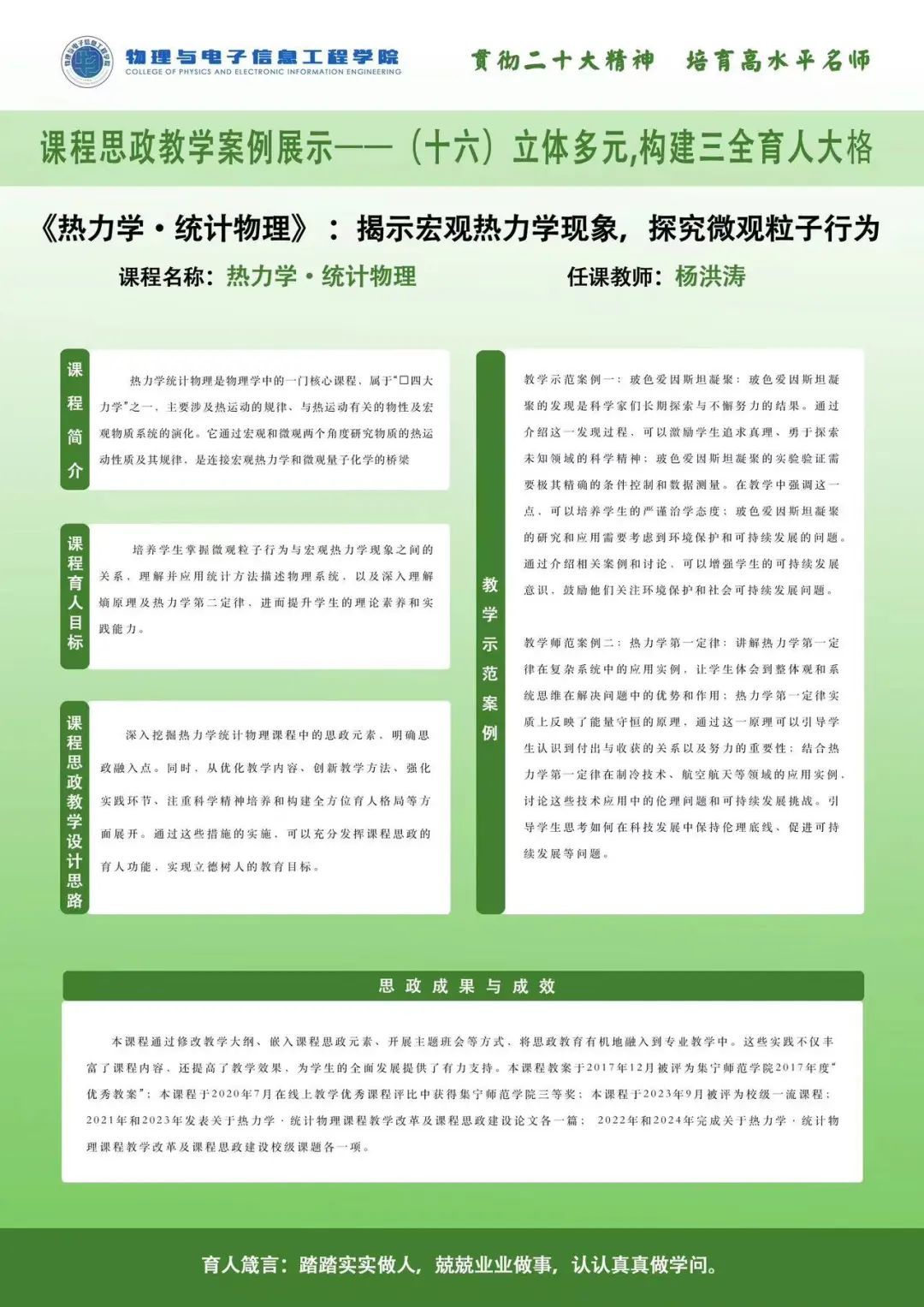 为践行为党育人、为国育才的崇高使命,物电院紧扣立德树人根本任务,推进习近平新时代中国特色社会主义思想进教材进课堂进头脑,全面推进课程思政建设,将课程思政元素充分融入到课程教学目标和教学过程中,使每门课程都有思政元素,每节课堂都有育人功能。学院通过开展系列“三全育人理念下物理与电子信息工程学院课程思政教学探索”活动,全面推进学院课程思政课堂教学改革,不断提升教师政治素质、教育教学水平,形成良好的全员全程全方位育人氛围。