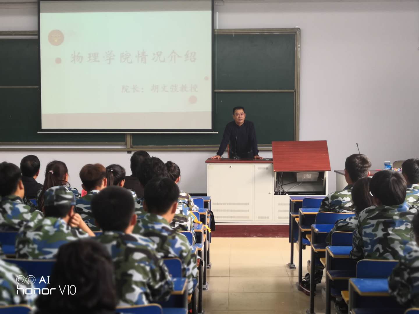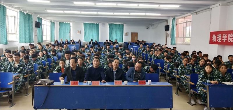 2018年9月14日上午8:00物理学院2018级开学典礼暨入学教育在主教楼201举行。学院党总支书记韩天荣、院长胡文弢、党总支副书记董永胜、副院长王金宝及2018级物理学班班主任夏俊杰参加此次开学典礼。