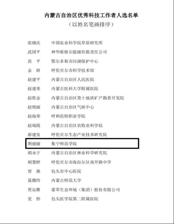 近日,根据自治区规范评比达标表彰专项组《关于2022年内蒙古自治区优秀科技工作者评选表彰活动的批复》及有关规定,内蒙古科协和内蒙古人社厅联合组织开展评审工作,经专家评审和面向社会进行公示,决定授予80名同志“内蒙古自治区优秀科技工作者”称号,beat365教师荆丽丽同志获此称号。