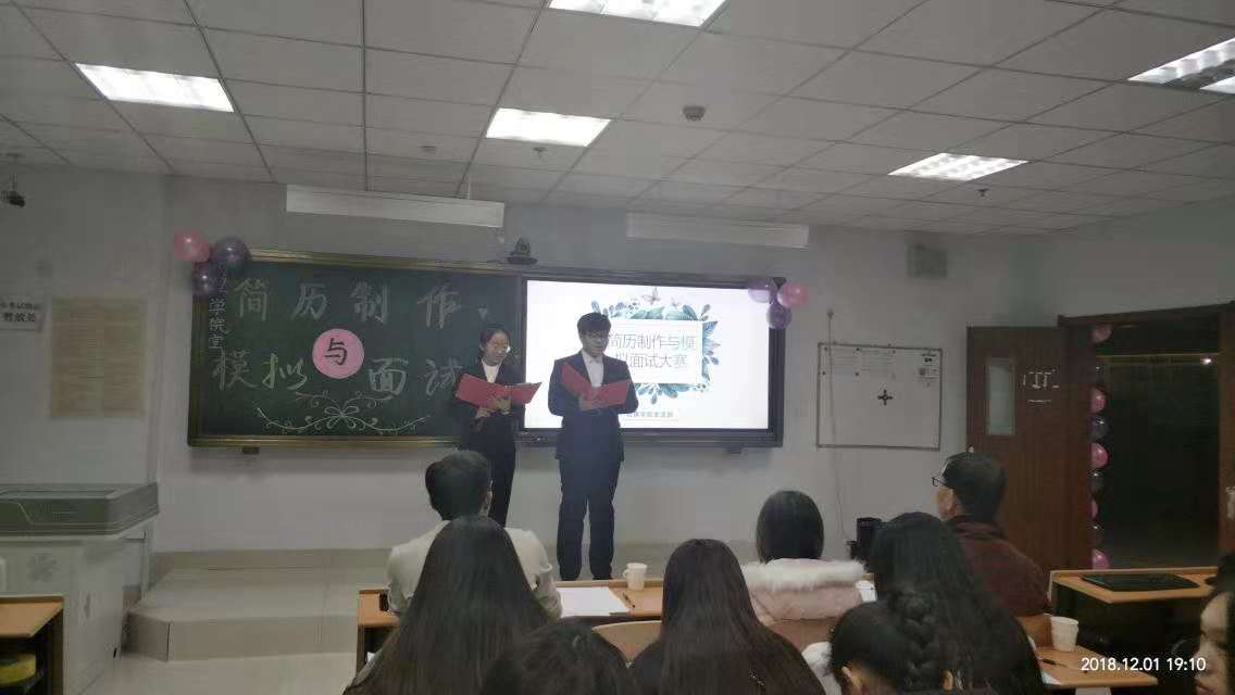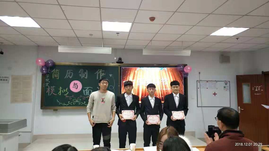 共有10位选手参与本次大赛。本次大赛共分为两个环节,简历制作和模拟面试。大赛的评分规则如下,第一部分:简历制作共计50分,其中简历的外观设计占20分,简历的用语占30分,第二部分:模拟面试共计50分,其中举止礼仪占10分,回答问题占30分,对选手的综合分析占10分。比赛紧张而激烈尤其是评委提问的环节,评委针对选手的个人简历和现场表现,运用压力面试、行为面试、能力面试等方法,考查选手的临场应变以及抗压能力。选手们沉着冷静的表现,大方的举止值得我们学习与称赞。在紧张的比赛之间还穿插着同学们精彩的歌舞表演,不仅帮助参赛者舒缓了压力更增加了比赛的趣味性。经过莅临本次大赛嘉宾的认真评选,最终一人荣获一等奖,两人获得二等奖、三人获得三等奖以及获得优秀奖的参赛者三名。由莅临的嘉宾为获奖者颁发了荣誉证书,并合影留念。最终由陈宗黎老师为此次大赛做了总结点评。