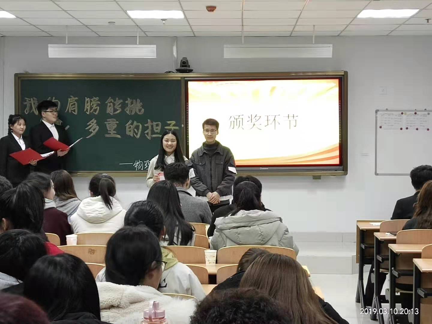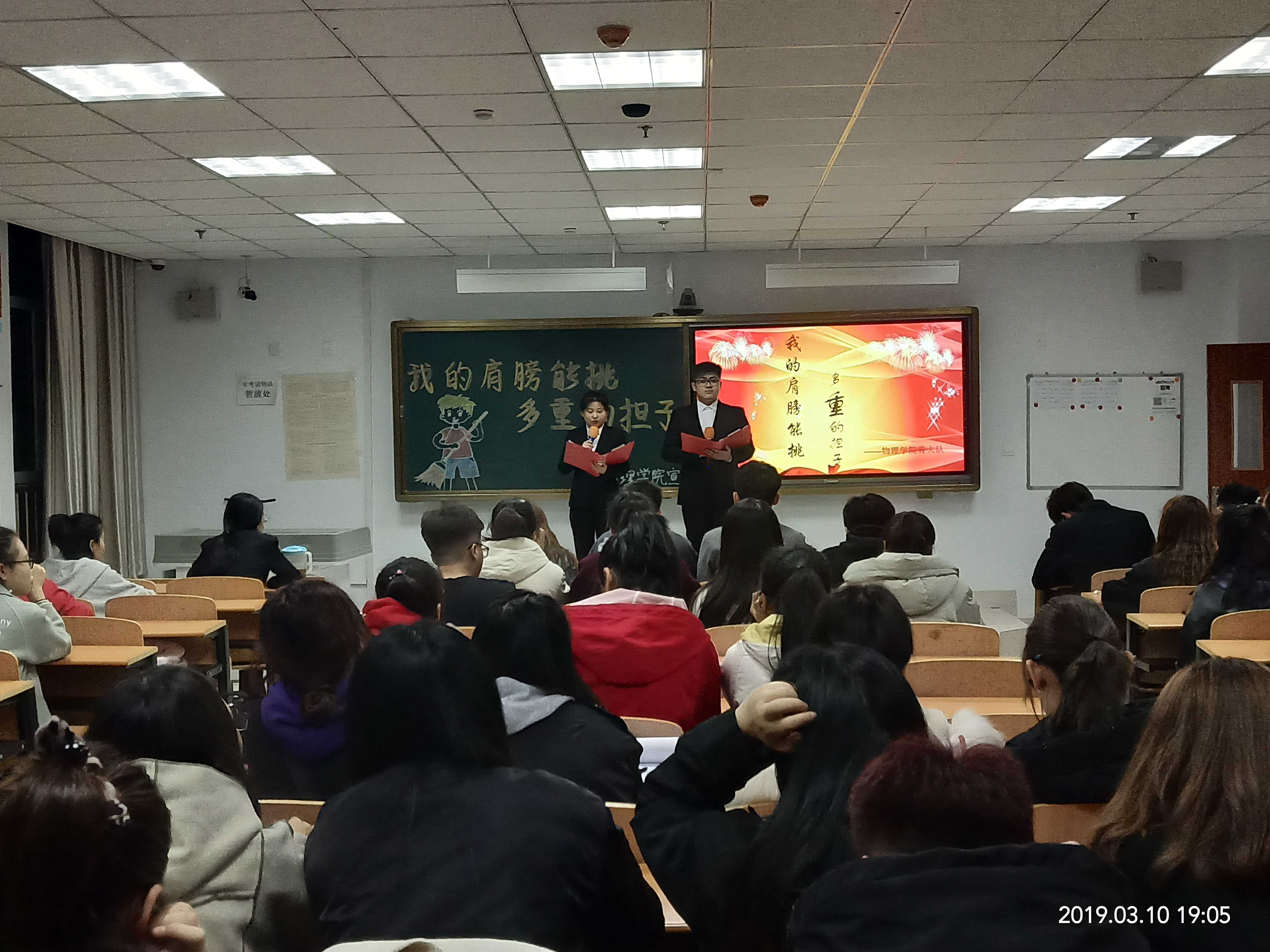 为深入学习贯彻习近平新时代中国特色社会主义思想,落实党的十九大精神,以庆祝建国七十周年,“五四”运动一百周年为契机,beat365组织开展了大学生寒假社会实践活动。物理学院为了给各位同学们提供一个交流和学习的机会,同时对寒假期间在社会实践中表现优异的同学进行表彰,特于3月10日在逸夫楼405隆重举办了题为“我的肩膀能挑多重的担子”2018年度寒假社会实践的表彰大会。