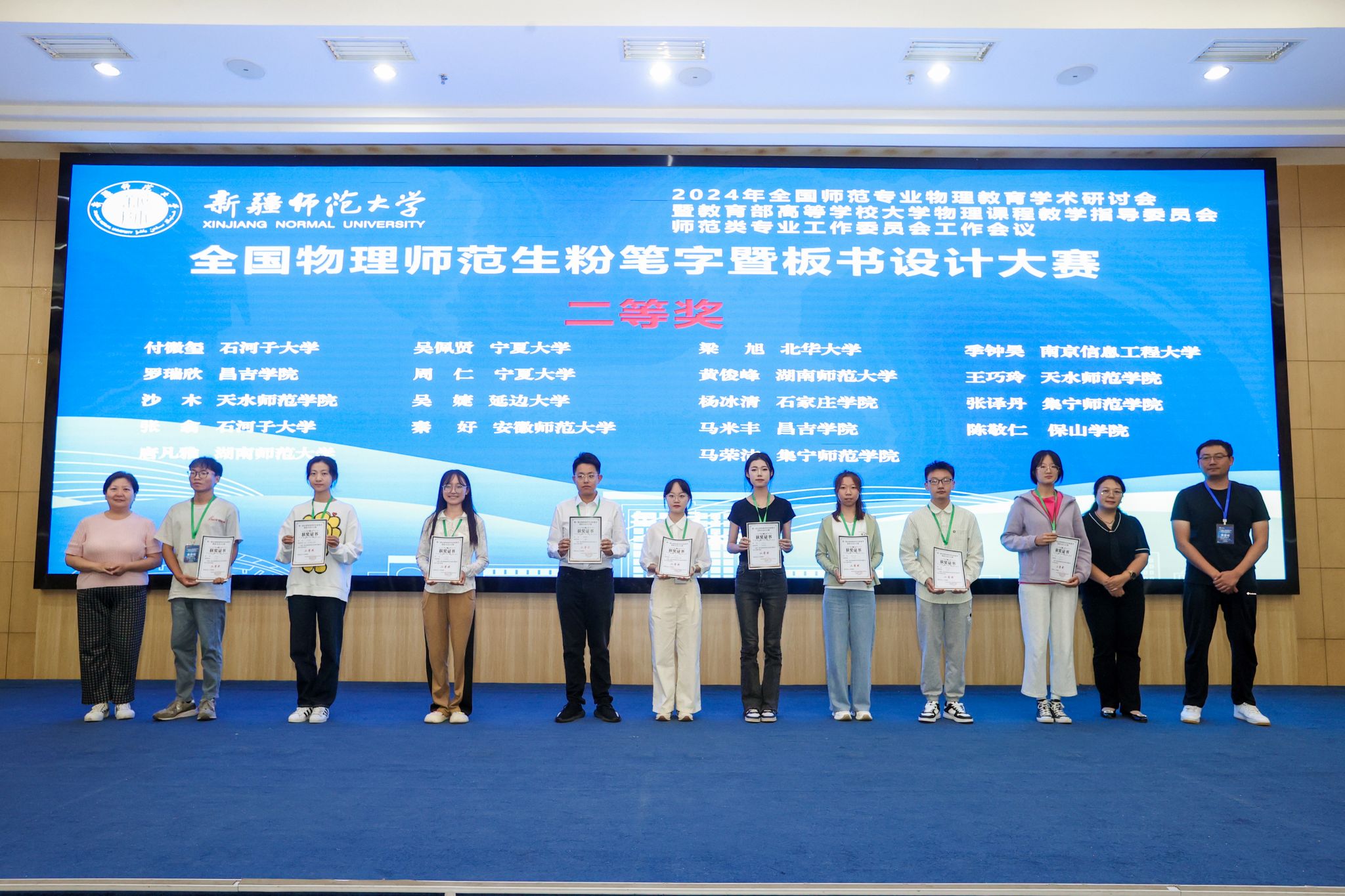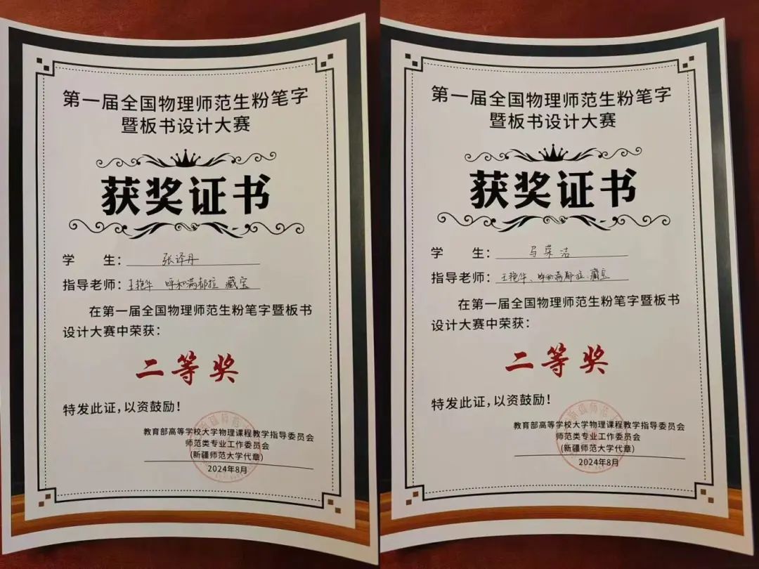 会议中一项重要议程即“第一届全国物理师范生粉笔字暨板书设计大赛决赛”,beat365在线唯一官网物理与电子信息工程学院的张译丹、马荣洁两位同学凭借扎实的专业基础,并在我院指导教师悉心的教导下,在众多参赛队伍中脱颖而出,顺利通过初赛进入到全国总决赛,并在决赛中取得了优异的成绩。在本次比赛中,荣获了两个二等奖的好成绩,为物理与电子信息工程学院赢得了荣誉!