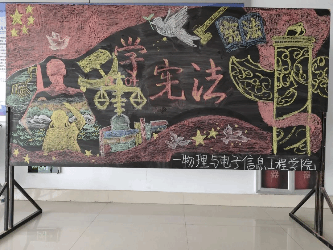 为加强宪法宣传,普及宪法知识,弘扬宪法精神,维护宪法权威,提升师生法律素养和意识。在“12.4”国家第十一个宪法日来临之际,物理与电子信息工程学院开展了“以板报为媒体,传宪法之声”宪法宣传周活动。