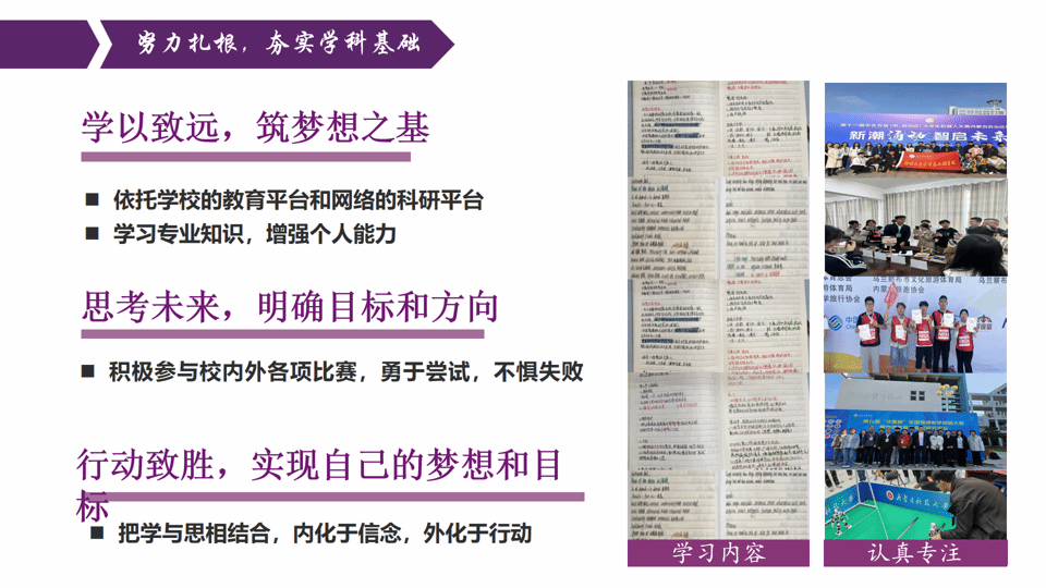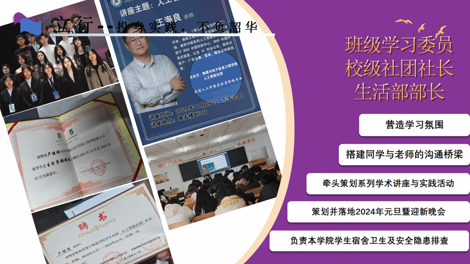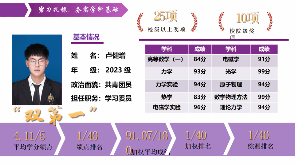 岁月不负追梦人,奋斗不负少年时。在充满朝气的校园里,总有一群笃行者以勤奋为笔、坚韧为墨,在求知的长卷上挥洒热血;以探索为梯、担当为帆,用初心照亮前行的征途。今天,让我们一同走近2024-2025学年优秀学生标兵卢健增的成长之路,聆听他们脚踏实地、勇攀高峰的奋斗故事,感受荣誉背后的坚守与担当,汲取逐梦前行的奋进力量!