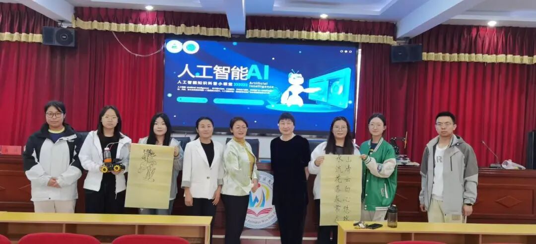 为了让同学们更直观地感受人工智能的魅力,冯娜娜、杨涛同学带领着“机器人书法老师”惊艳亮相。该机器人搭载高精度机械臂和智能算法系统,能精准模拟书法大师的运笔技巧。随着输入指令,机器人笔尖轻触宣纸,行云流水般写出一幅幅遒劲有力的书法作品以及绘画作品。引得同学们纷纷围拢,惊叹声与掌声此起彼伏。