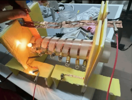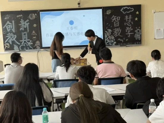 王春明团队制作了《自感与互感电路装置》教具。主讲人王春明对教具的原理、制作过程和教具涉及的知识点讲解十分清晰。他们以自感与互感教具为核心,先从理论基础入手,详细阐释自感和互感现象的原理;接着结合教具设计,说明三极管、线圈等元件的具体作用;还通过演示小线圈靠近时产生磁场使二极管发光的现象,将抽象的电磁知识直观地呈现出来。此外,团队还关联生活中的实际应用,让大家真切感受到物理知识的实用性与奇妙之处,充分展现出较强的知识整合能力与讲解能力。