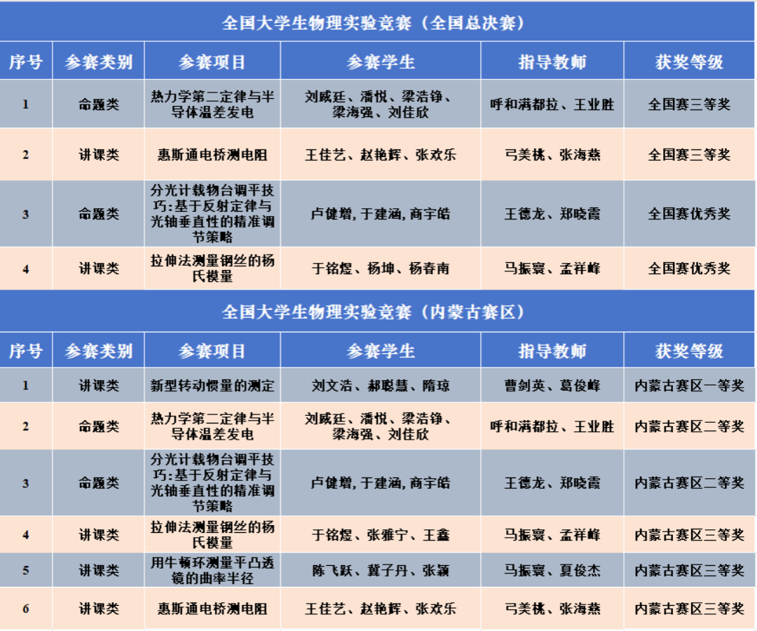 大学生物理实验竞赛是教育部认可的入选全国普通高校大学生竞赛排行榜的唯一物理类A类竞赛。本届比赛是自2010年赛事举办以来,参赛人数最多和规模最大的一次,共来自全国667所高校的2755支队伍、15715名师生报名参赛,280所高校的548支队伍共计1400余名师生进入到现场决赛环节。决赛过程中,各支队伍通过海报、视频、实物等多种形式,全方位展示了创新性物理实验作品。本届大学生物理实验竞赛(创新)全国赛自5月份启动以来,我院高度重视,组织师生积极备赛。2024年8月4日,在内蒙古民族大学参加了本项赛事的内蒙古区赛选拔赛,获得一等奖1项,二等奖2项,三等奖3项的好成绩。区赛后,指导老师又组织进入国赛作品经过多轮培育和反复打磨,最终在全国赛取得了优异的成绩。