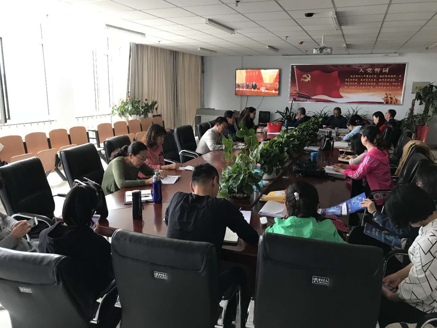 会议由物理学院党总支书记韩天荣主持,首先向全体人员介绍了此次大会的概况:“2018年5月4日上午10时,“纪念马克思诞辰200周年大会”在人民大会堂举行,中共中央总书记、国家主席、中央军委主席习近平出席大会并发表重要讲话。”然后,组织收看大会的直播视频,认真聆听了习近平总书记在纪念大会上的重要讲话。