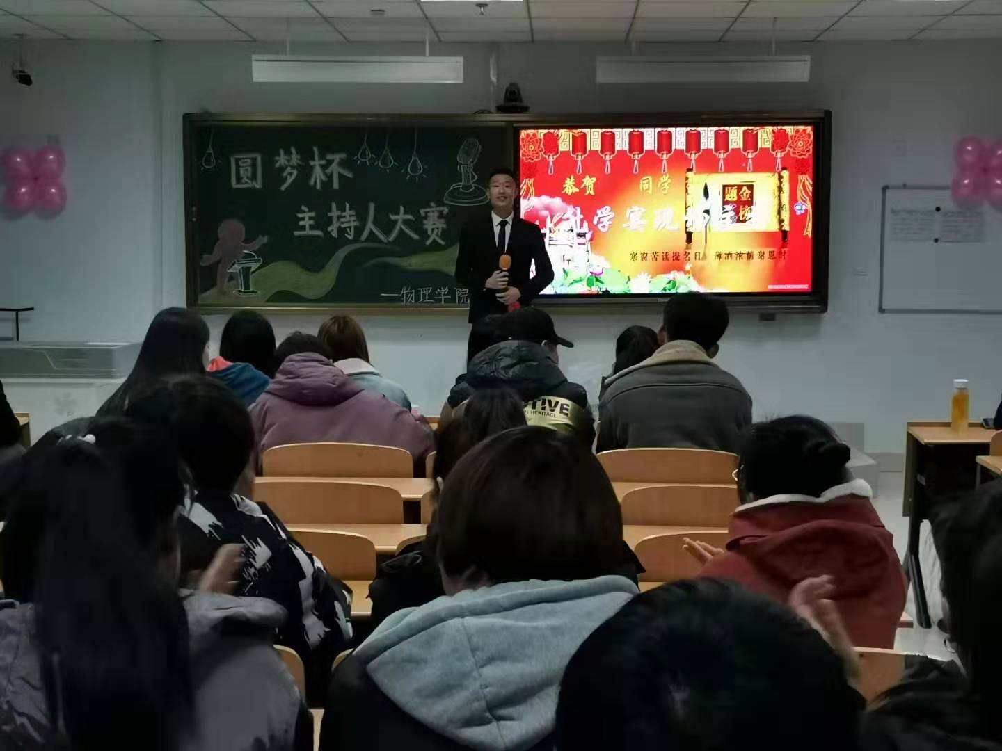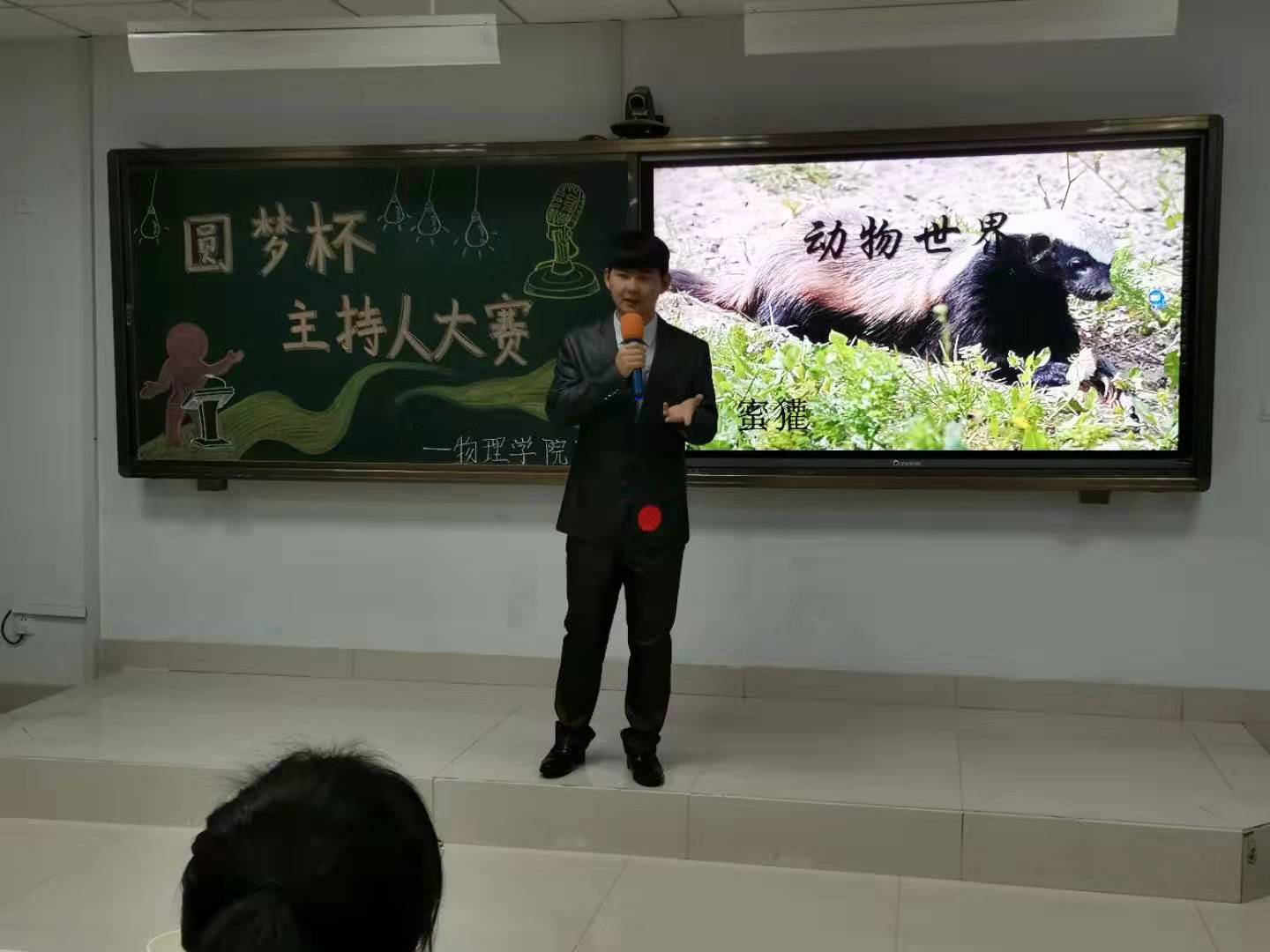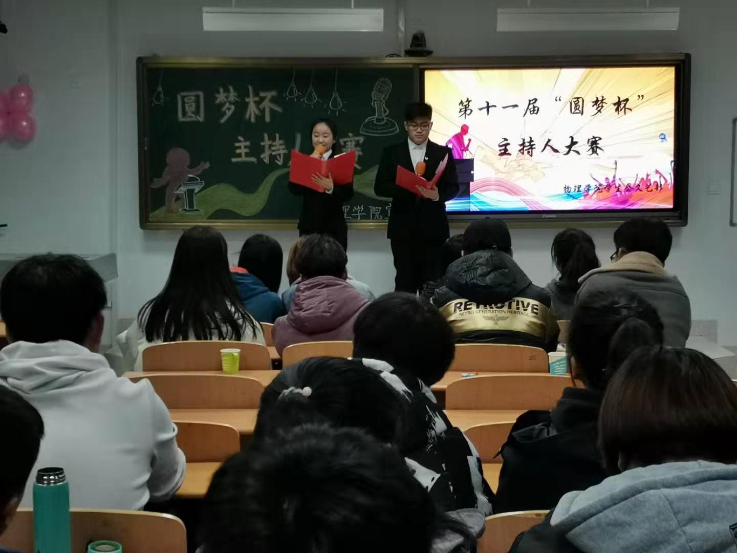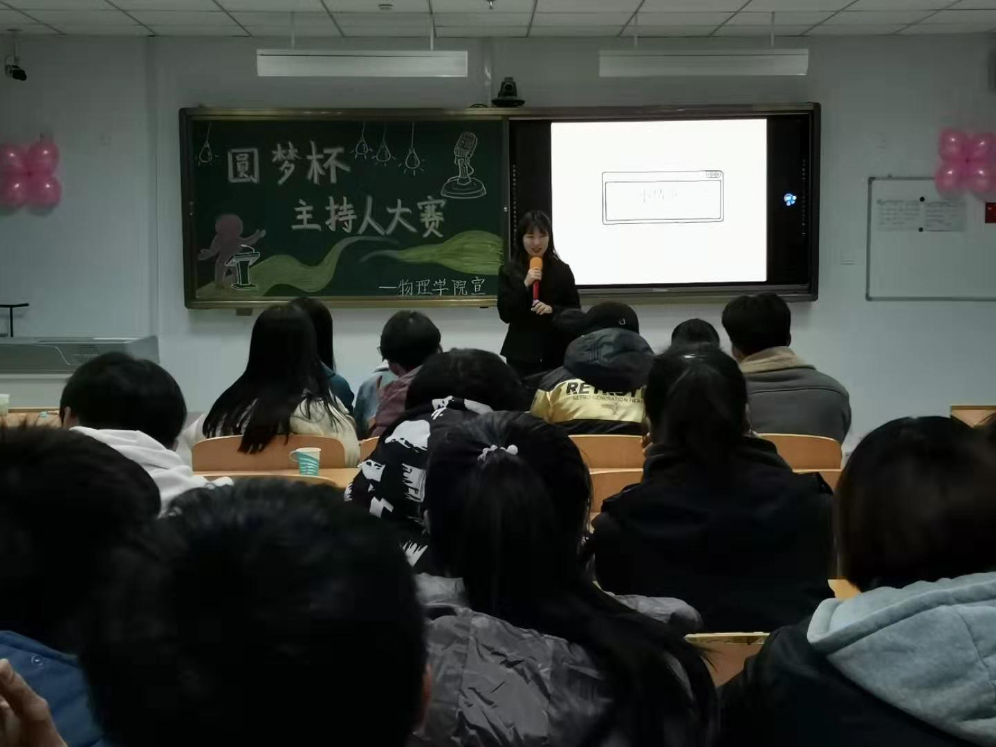 每个人都渴望走上舞台,每个人心里都潜藏着一个梦,舞台上的流彩霓虹与如花梦幻是我们每个人的向往与追求,站上舞台,你就是主角。为展现我院学生的精神面貌,张扬青春风采,物理学院于11月24日19点在逸夫楼405举办第十一届“圆梦杯”主持人大赛,莅临本次活动的嘉宾有现代服务学院、化学与化工学院、外国语学院以及体育学院主席,经济管理学院、计算机学院学生会主席团代表。