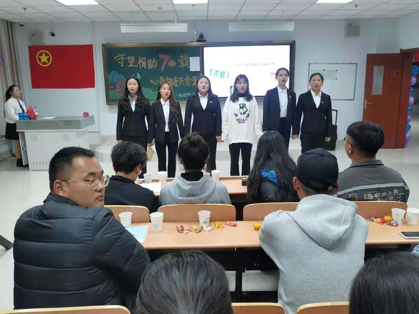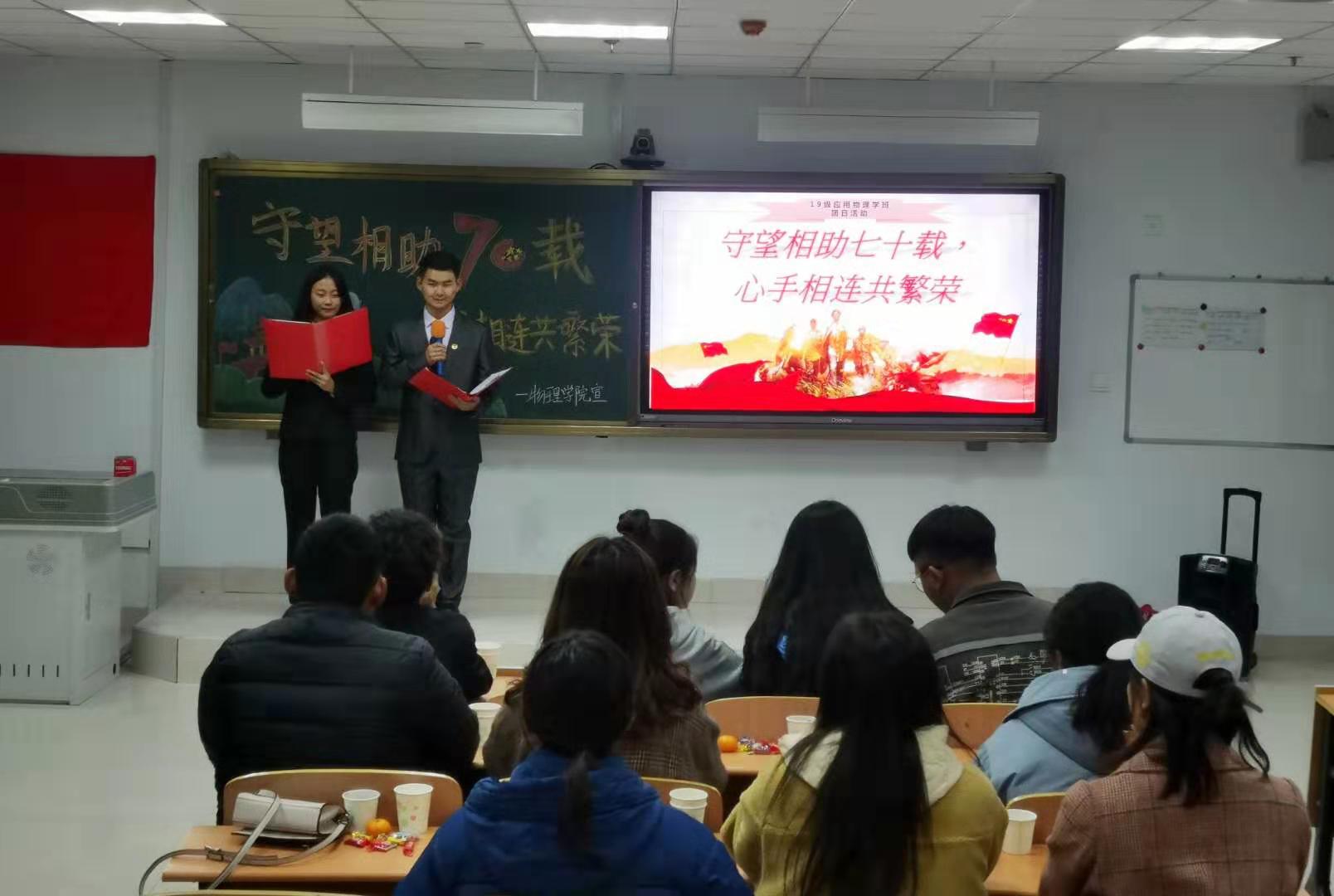 为深入贯彻学习习近平总书记关于新时代弘扬爱国奋斗精神系列重要指示。引导同学们不忘初心、牢记使命,把深深的爱国情怀转化为奉献祖国、服务人民的实际行动。歌颂祖国新成就,唱响时代主旋律,抒发广大青年学生对祖国的热爱之情。2019年10月24日晚七点,物理学院于逸夫楼405教室开展“守望相助70载 心手相连共繁荣”主题团日活动。数学学院学生会主席以及文学院、生命科学学院、政法与历史学院、体育学院、地理科学学院团总支副书记,化学与化工学院、文学院、现代服务学院、经济与管理学院、计算机学院学生会主席团代表团以及校学生会纪律监察部部长受邀出席。