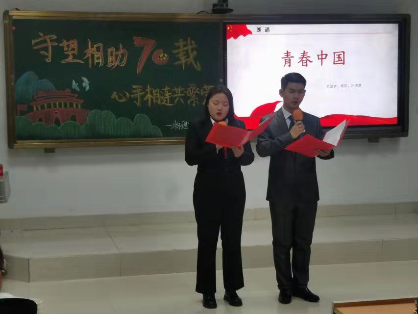 岁月悠悠,潮起潮落,共和国昂首阔步走进了2019年,迎来了她的70岁华诞。同学用《家在中国》《我和我的祖国》等歌曲歌颂祖国的伟大成就。本次团日活动还有小品《送礼钱规则》、舞蹈串烧等节目,在快乐的氛围中,不仅让同学们感受到了祖国的繁荣昌盛和民族凝聚力,更为祖国的强大而感到自豪,此次活动增强了同学们的凝聚力,激发了每一位新时代青年为祖国奉献的豪情壮志。