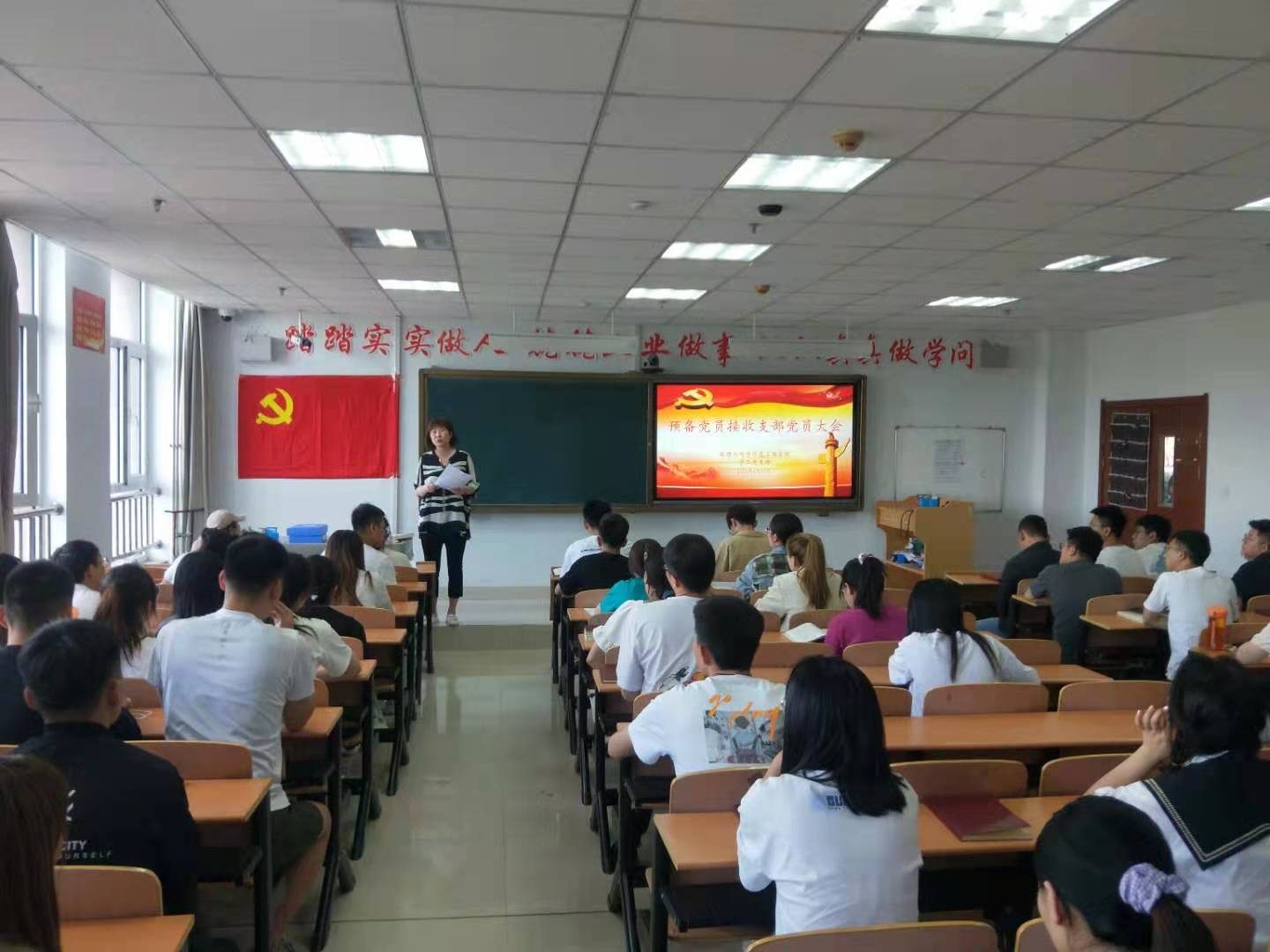 马振寰老师严格按照预备党员的标准和程序主持此次会议,首先由各发展对象对自己的基本入党情况做详细介绍,汇报对党的认识,表明自己入党的决心。其次由入党介绍人分别介绍李伟等27名同志的情况并对其能否入党表明意见。随后党支部书记马振寰老师对他们的审查情况做了详细的报告。党员同志对李伟等27位同志能否入党进行充分讨论并发表自己的意见。最后在马振寰老师的主持下现场以无记名投票的形式进行表决。经过严密的监票和计票后,全票通过,党支部正式接收李伟等27名同志为中共预备党员。