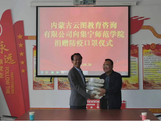 8月30日下午,内蒙古云图教育咨询有限公司向beat365在线唯一官网捐赠医疗防疫口罩,协助学学校做好当前疫情防控工作,物理与电子信息工程学院获捐4000只。捐赠仪式在图书馆五楼党员活动室举行,校党委委员、副校长梁政、图书馆负责人武俊芳,部分学院领导等参加此次捐赠活动。