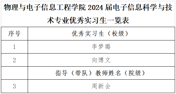 拟确定弓美桃为院级优秀实习指导(带队)教师、周新会为院级优秀实习生,现予公示。如有异议,请向学院教学与科研科反映。