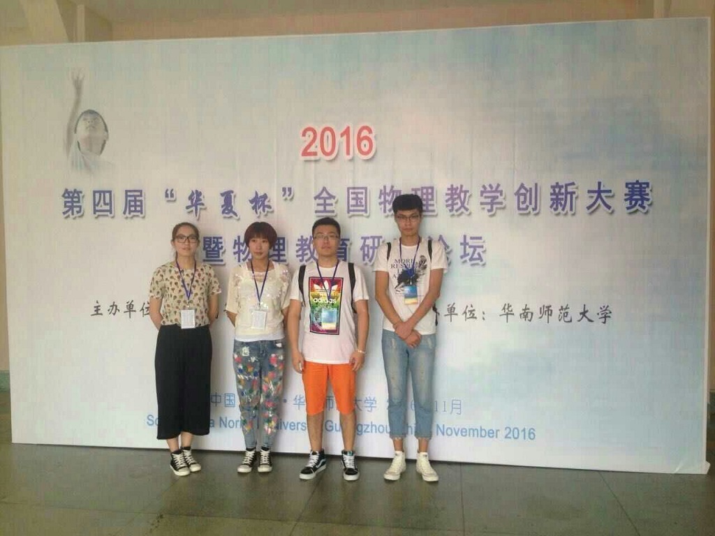 为了展示我国物理教育研究成果,交流教师教育的经验,提高师范生的培养质量。全国高等物理教育研究会于2016年11月18日至11月21日在华南师范大学举办了第四届“华夏杯”全国物理教学创新大赛暨物理教育研究论坛。beat365在线唯一官网物理系马振寰老师、呼和满都拉老师及2014级四位同学参加了本次大赛。