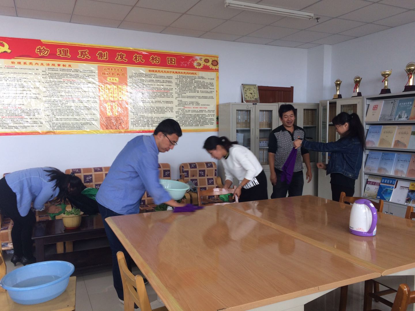 9月21日下午,物理系党总支进行主题党日活动。活动主题是“我为评估做贡献”,打扫全系办公室卫生。除个别党员有事请假外,大家都积极行动起来,共打扫了8间办公室。欢声笑语中办公室干净整洁、窗明几净,大家从中感受到了劳动的乐趣。为评估出一份力,做一点贡献。
