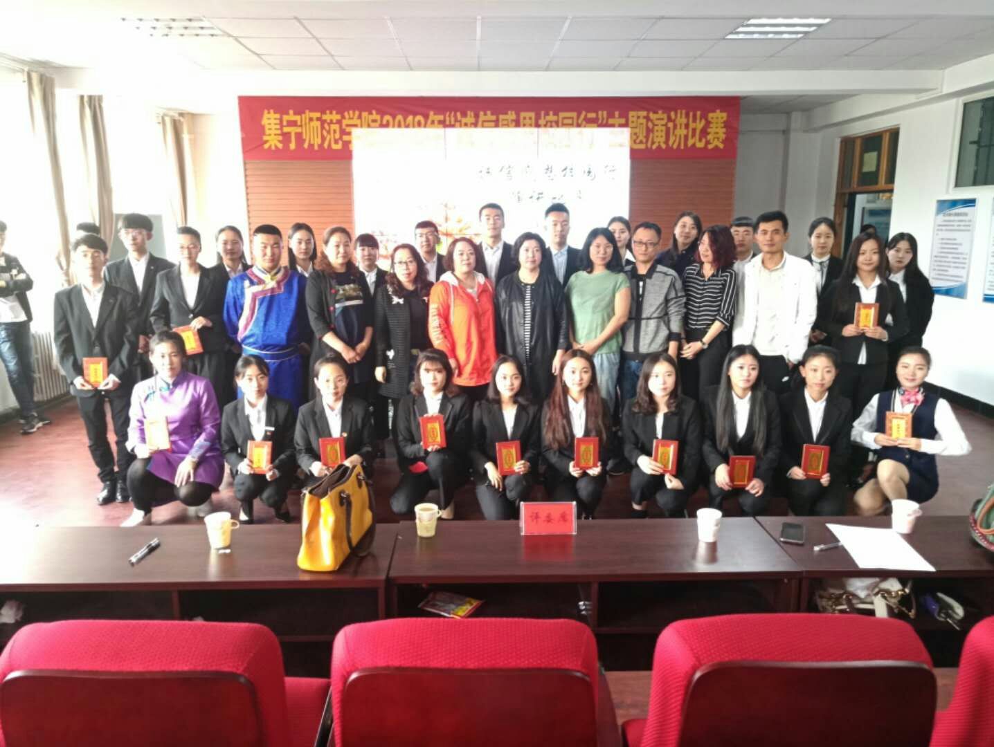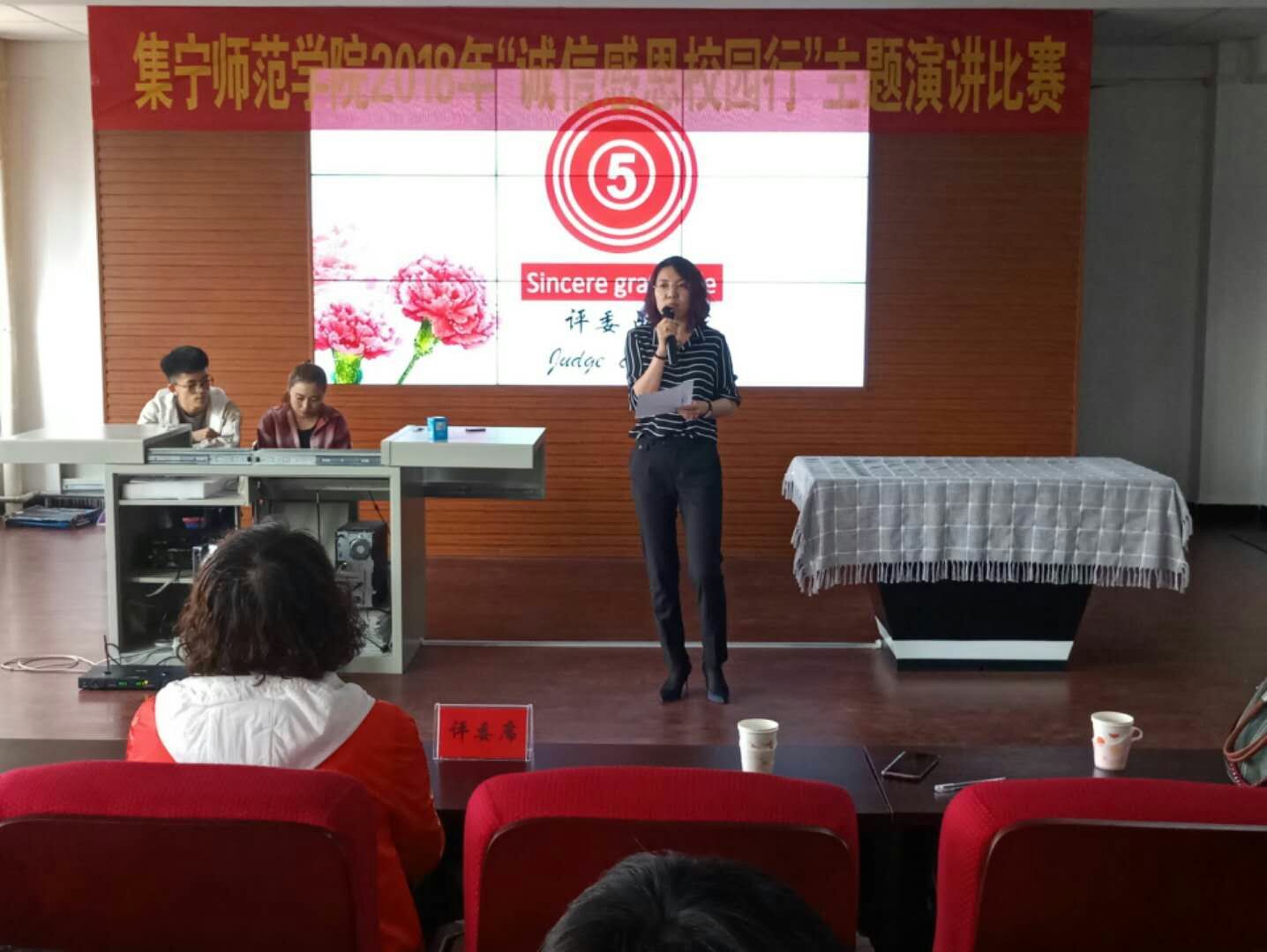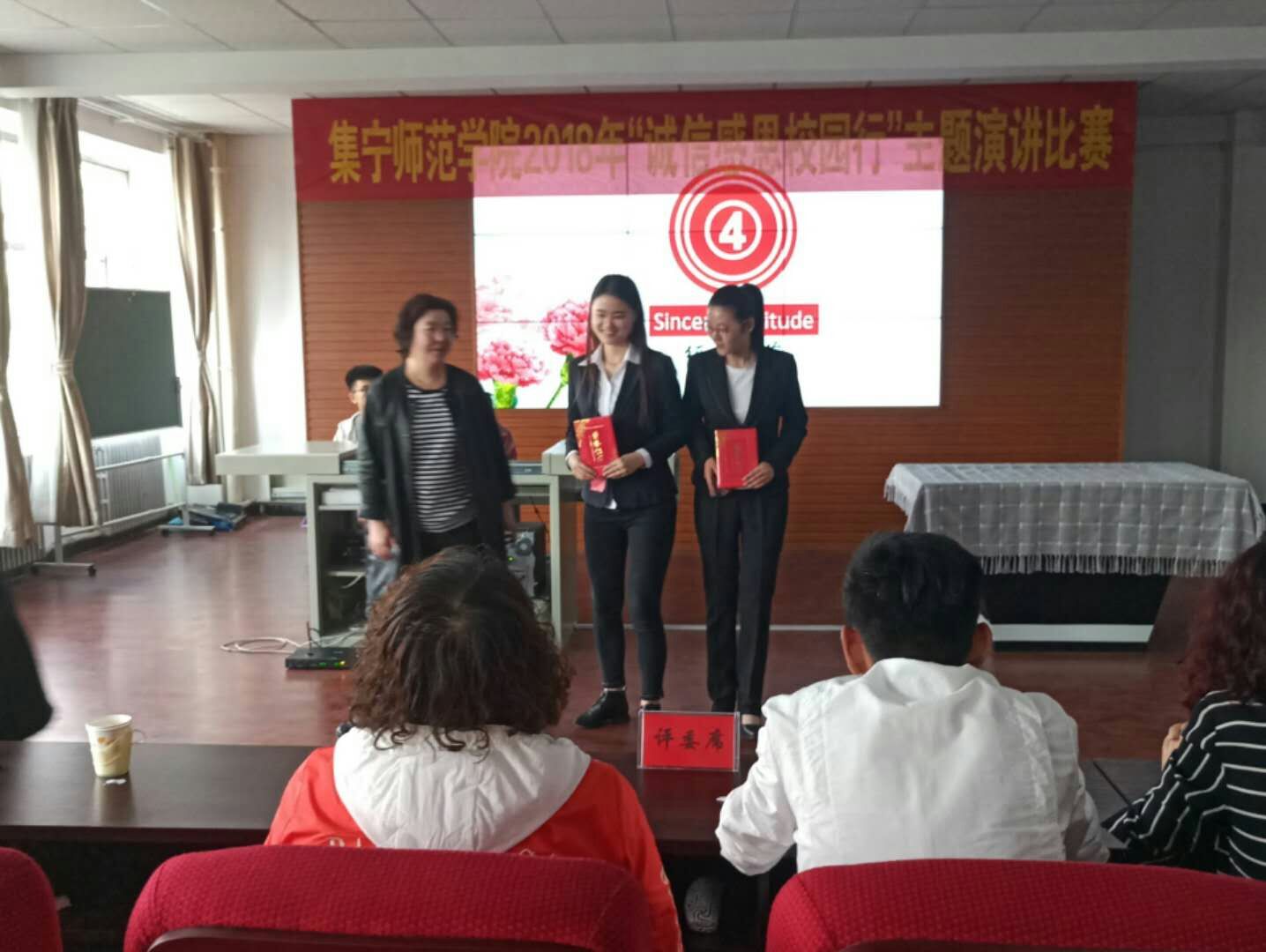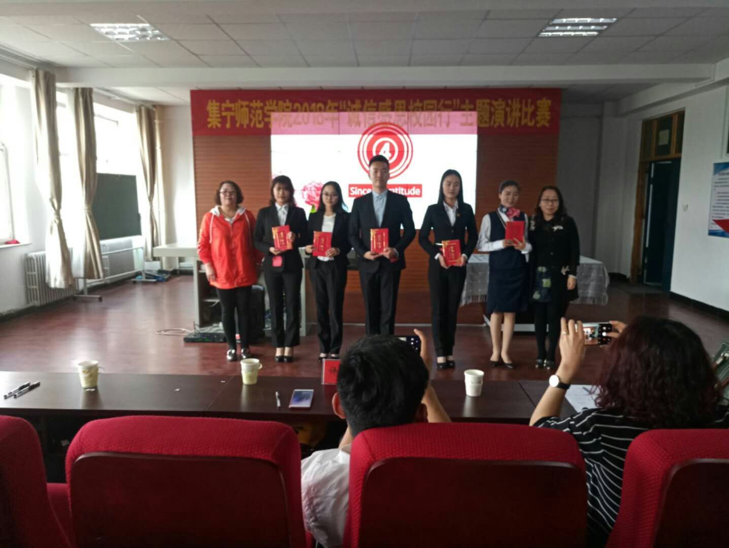 为了进一步提高当代大学生的诚信感恩力度,培养当代大学生的诚信精神,由校学生处主办物理学院承办的“诚信感恩校行”主题演讲比赛于2018年5月8日下午在主教楼219举办。担任本次比赛的评委有学生处勤学管理中心主任孙燕老师,学生处综合管理科科长杜雪梅老师,学生处思政教育科科长黄倩老师,经济与管理学院学生处主任尚抒老师,物理学院赵鹏宇老师,政法与历史文化学院学工办主任田博老师,化学与化工学院赛汉其其格老师。