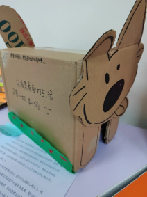 董智越《“心灵驿站”倾诉箱》作品简介:“心灵驿站”倾诉箱的意义是为了让同学们将自己平时说不出口的话或是自己的烦恼、困惑、情绪等等都写进纸条,从纸箱两侧塞到倾诉箱内,每天定时都会有心理协会志愿者将纸条取走,从纸张上聆听大家的内心,再给大家纸条上的回复,第二天送回倾诉箱,从而实现人与人之间的匿名交流,缓解大家心理压力。