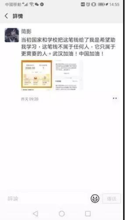 她说:“我自己也是普通家庭,学费是向国家申请了贷款,所以我很感恩国家和学校用这笔钱助我完成学业。但在疫情面前我不能无动于衷,希望尽自己的一点力量。这几天我也收到了很多为我这种行为点赞的人,大家认可这种行为,那么总结起来我们都是一样的人,都是希望武汉尽快好起来的中国人。也请大家把更多的焦点聚集到疫情上,我相信疫情会很快结束。中国加油!武汉加油!”