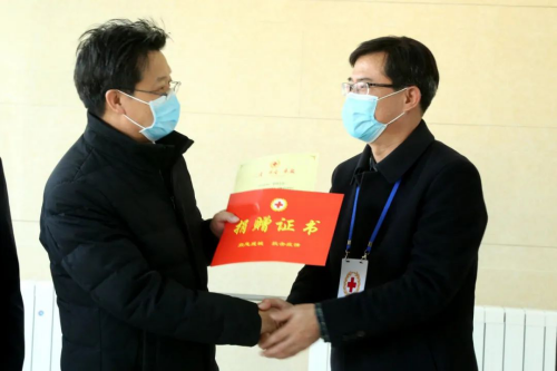 市红十字会党组书记、常务副会长贾玮,市卫健委副主任刘浩出席捐赠仪式。市中心医院党委副书记、纪委书记于志海,市第二医院党委副书记孙东风,市疾控中心主任刘春芳代表三家抗疫医疗单位接收捐赠。