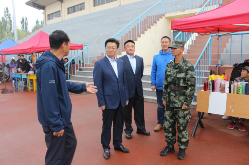 朱玉东一行向武警乌兰察布支队排长杨喜磊详细了解了学生训练情况,亲切询问地理科学学院退伍复学学生李想在部队以及返校后的生活与学习情况。