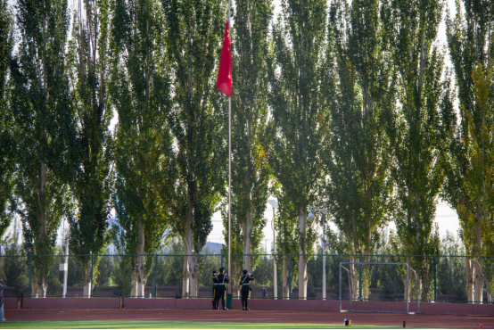 在庄严的升旗仪式中,全体人员起立,奏国歌,升国旗。