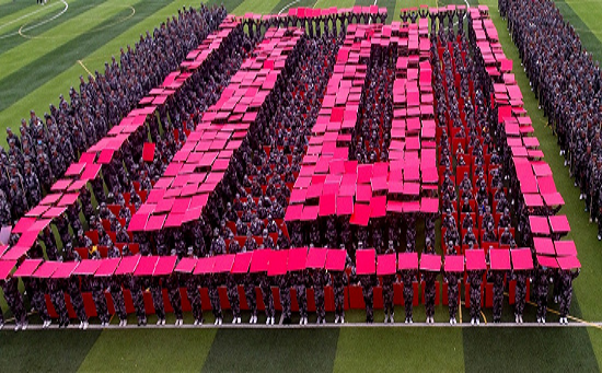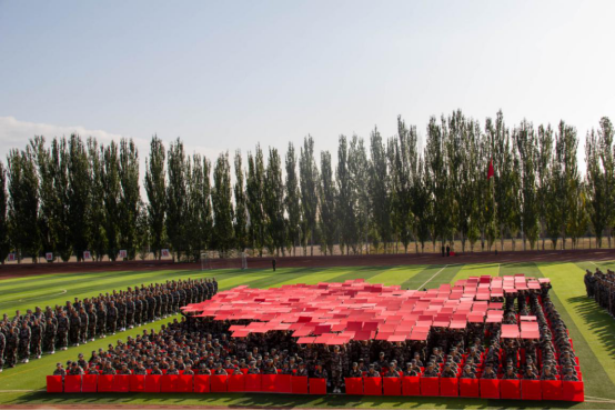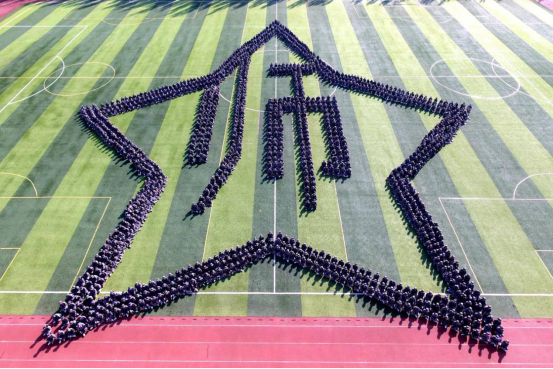 在方阵以图形变换组成的倒计时中,2020级新生军事训练汇报表演正式开始。泉山校区由1400名女生组成的方队摆出“1958”、“2009”、“JNSY2020”三个具有重大意义的年份字样,回顾了学校发展变迁的重要历史节点;以“长城”、“祖国万岁”、“中国地图”、“爱我集师、爱我中华”、“春华秋实桃李满天下,教书育人英才遍草原”、“国旗”、“帆船”“五角星与师”等图案致敬教师、告白集师、表白祖国。