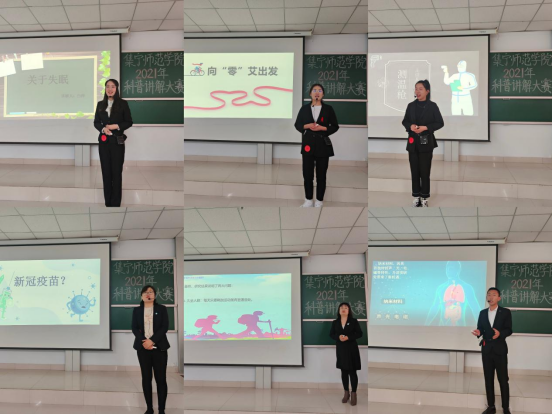经过预赛,共有14名选手进入了校级决赛。比赛由自主命题讲解和科技常识问答两个环节组成。比赛中,选手们借助多媒体等辅助手段,用科学、趣味、通俗的语言,深入浅出地讲解了生活中极为常见的健身、肿瘤的生长、失眠、沙尘暴、新冠疫苗、艾滋病等知识,让在场的观众感受到了“原来科学就在身边”。