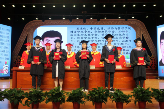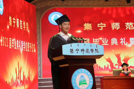 2021届毕业生代表王亚桥发言。他在发言中向母校及全体老师表达了深深的谢意。他表示,是在母校四年的学习和生活才使各位学子成为了更好的自己。毕业学子们即将踏上新的人生旅途,希望同学们此去繁花似锦,再相逢依旧如故,有足够的勇气去面对挫折,追逐梦想。