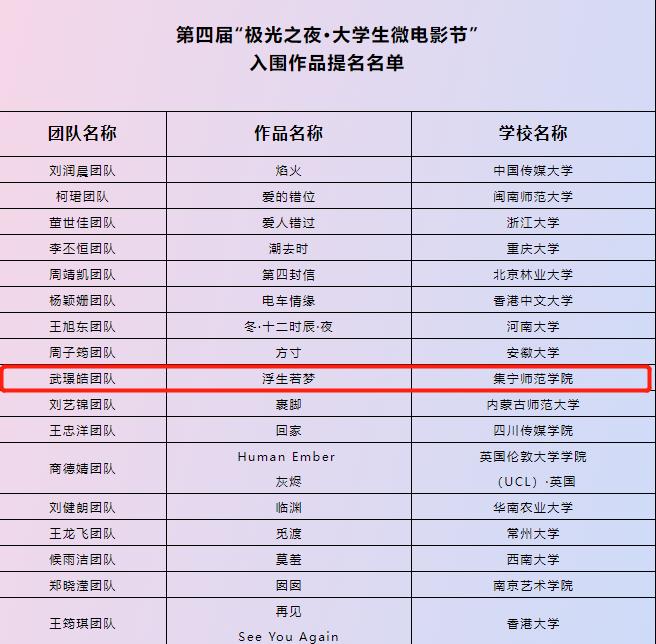 11月1日,由合肥市文化和旅游局、安徽巢湖经济开发区管委会与巢湖市人民政府、合肥易舍传媒有限公司联合主办的第四届“极光之夜大学生微电影节”落下帷幕,来自全球华人大学生的400余部作品中,经过专家组考察和研究,共选出45部提名的入围作品,其中现代服务学院由青年教师宝力、庄悦指导,18级播音与主持艺术班武璟皓、隋亚东、辛舒畅主创,19级播音与主持艺术班王金雨、张燕峰、李明洋、王杰参与制作的微电影《浮生若梦》成功入围。此次比赛全区共入围两部作品。
