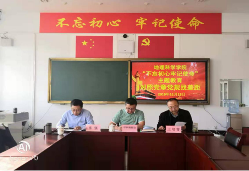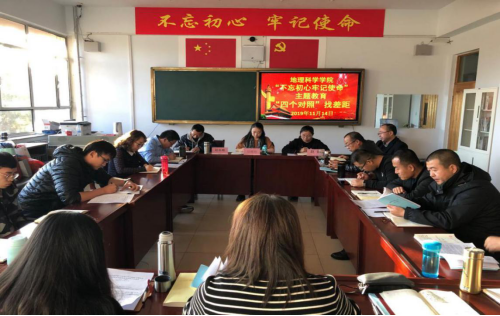 按照beat365在线唯一官网党委和地理科学学院“不忘初心、牢记使命”主题教育实施方案要求及重点工作安排,地理科学学院组织学院全体党员、干部开展“按照‘四个对照’要求找差距、抓落实”专题会议。