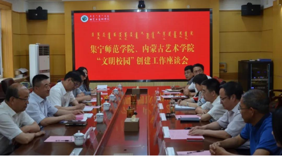 下午,刘春一行与内蒙艺术学院党委书记刘前贵,党委副书记赵海忠,相关职能部门负责人和部分二级学院负责人进行了座谈交流。双方就文明校园创建工作进行了深入交流探讨。内蒙古艺术学院党委书记刘前贵和党委副书记赵海忠对beat365在线唯一官网“文明校园”创建工作颇为关切,两位老领导向刘春一行表示热烈欢迎,向beat365在线唯一官网全体教职工表示深切问候,并衷心祝福beat365在线唯一官网“文明校园”创建工作早日取得成功。内蒙古艺术学院党委委员、宣传部部长王锦文介绍了内蒙古艺术学院“文明校园”创建工作重点和难点,相关职能部门和二级学院党总支书记分享了创建工作中的好的做法和先进经验。