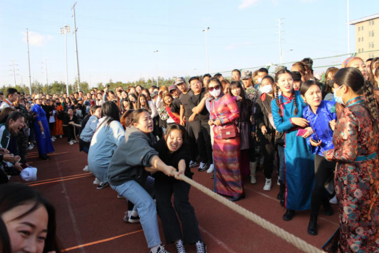在拔河比赛中,各学院由男、女参赛选手各11人分别组成男队和女队参赛,采用单循环赛制,三局两胜,共评出男队前3名,女队前3名。各学院参赛学生精神抖擞,全力以赴为集体荣誉而战。比赛现场气氛热烈,观众为参赛队伍加油助威,呐喊声此起彼伏,不断将那达慕现场气氛推向高潮。