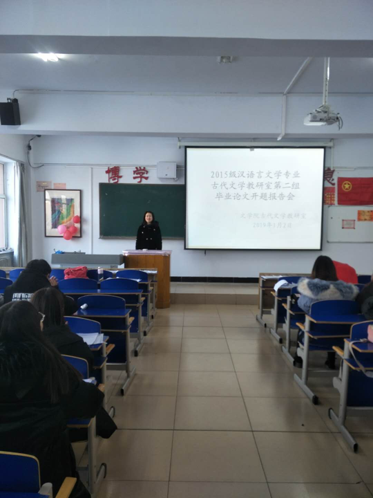 2019年1月2日,文学院在主教楼三楼320教室举行了2015级汉语言文学专业古代文学教研室第二组毕业论文开题报告会。文学院教师李俊、孙振涛、刘春芳、樊伟俊、妥静参加了本次毕业论文开题报告会。