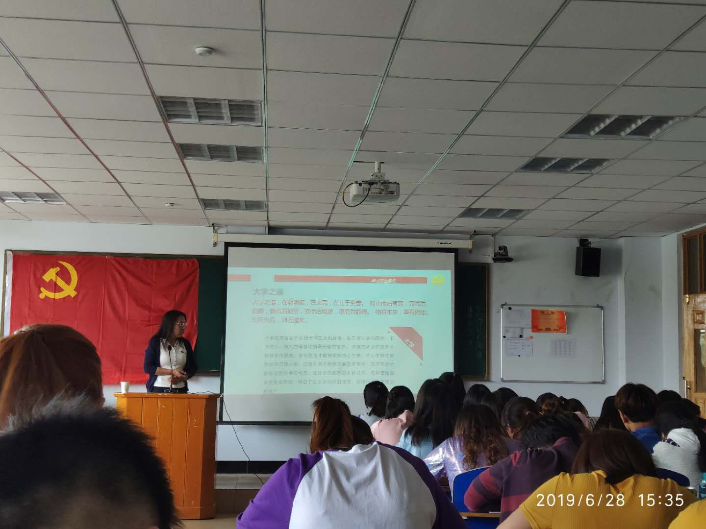 本次培训形式多样,文学院党总支组织入党积极分子观看了影片《建军大业》和纪录片《光荣的追寻》;特邀自治区思政名师工作室刘嵘教授,以“从中美贸易摩擦看我国的自主创新”为题,以中美贸易战作为背景,讲述了中国进入新时代后所占据的世界地位和面临的机遇挑战,让大家从贸易战的背后看到中国的自主创新之路,从中体会到了中国共产党在祖国发展过程中所起到的重要作用;马克思主义学院张爱梅老师以“弘扬五四精神,肩负历史使命”为题,阐述了习近平总书记在纪念五四运动100周年大会上的重要讲话精神,号召大家争做新时代青年,也使大家对五四精神有了更深的感悟;文学院李秀林教授,结合自己在“学习强国”平台学习的感受,用习近平总书记的语录系统地阐释了学习可以“修身”、“齐家”、“治国”、“平天下”的大学之道,畅谈了学习的重要性,让每一位积极分子受益匪浅。