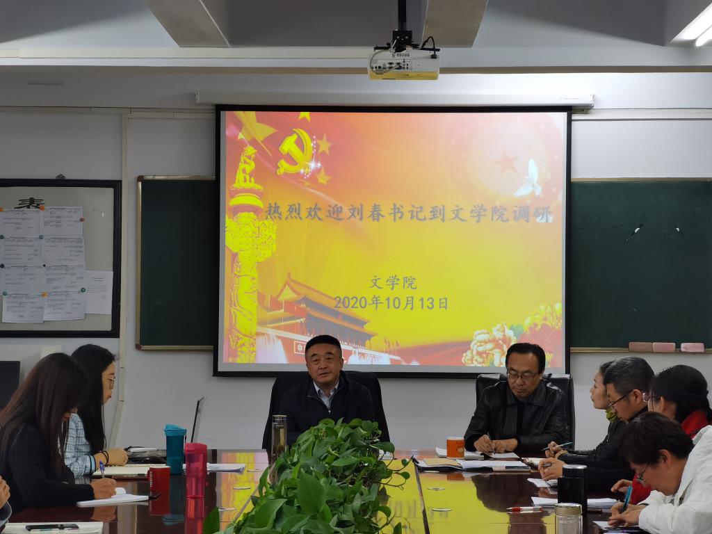 10月13日,beat365在线唯一官网党委副书记刘春深入文学院调研座谈。文学院党总支书记张一弘,副院长郭鹏,全体教师、学生代表参加调研。